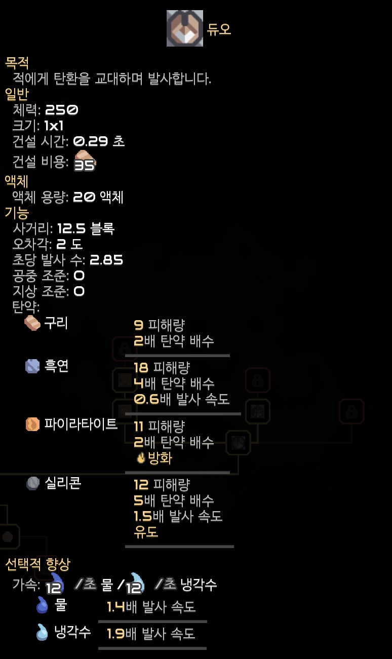 기본 터렛인 듀오는 지상과 공중의 적 모두 공격 가능하며 네 종류의 탄약을 사용할 수 있습니다.