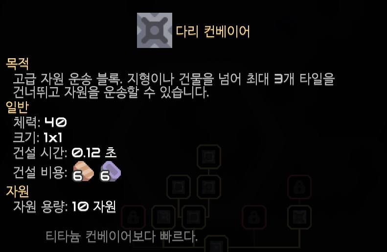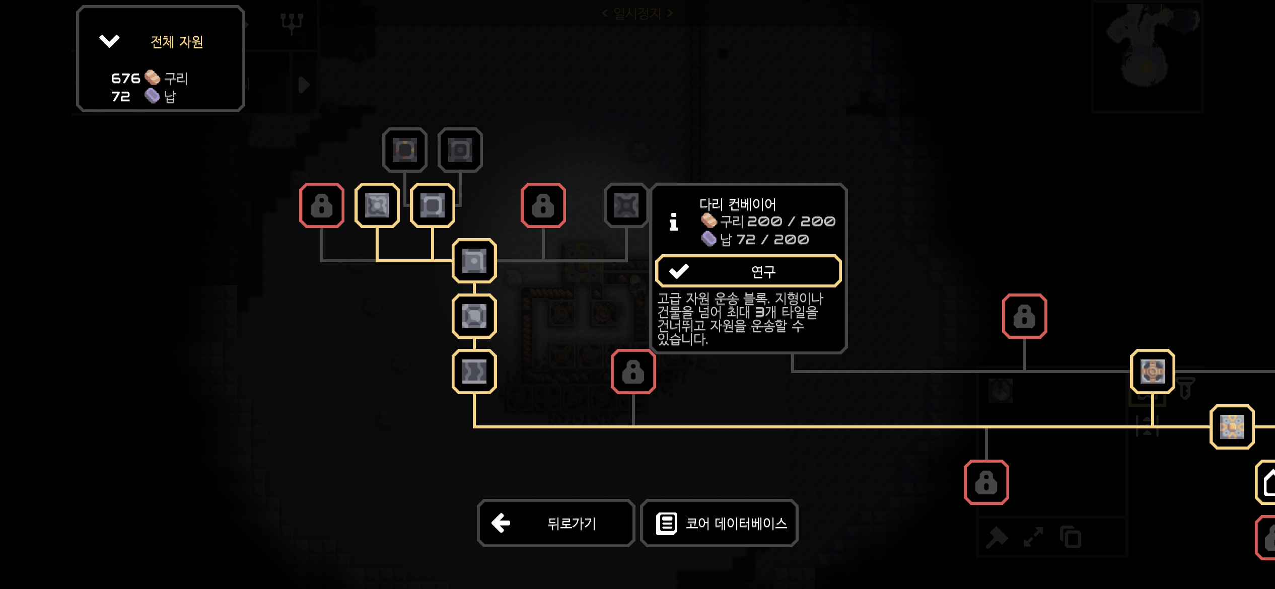 코어 아래 구리 광맥에 건설한 기계식 드릴중 몇 개에 구리가 가득 차서 작동하지 않고 있습니다. 다리 컨베이어의 문제는 없다고 보이는데, 자원의 이동속도가 생산속도보다 느려서 출력이 막힌 것 같습니다.