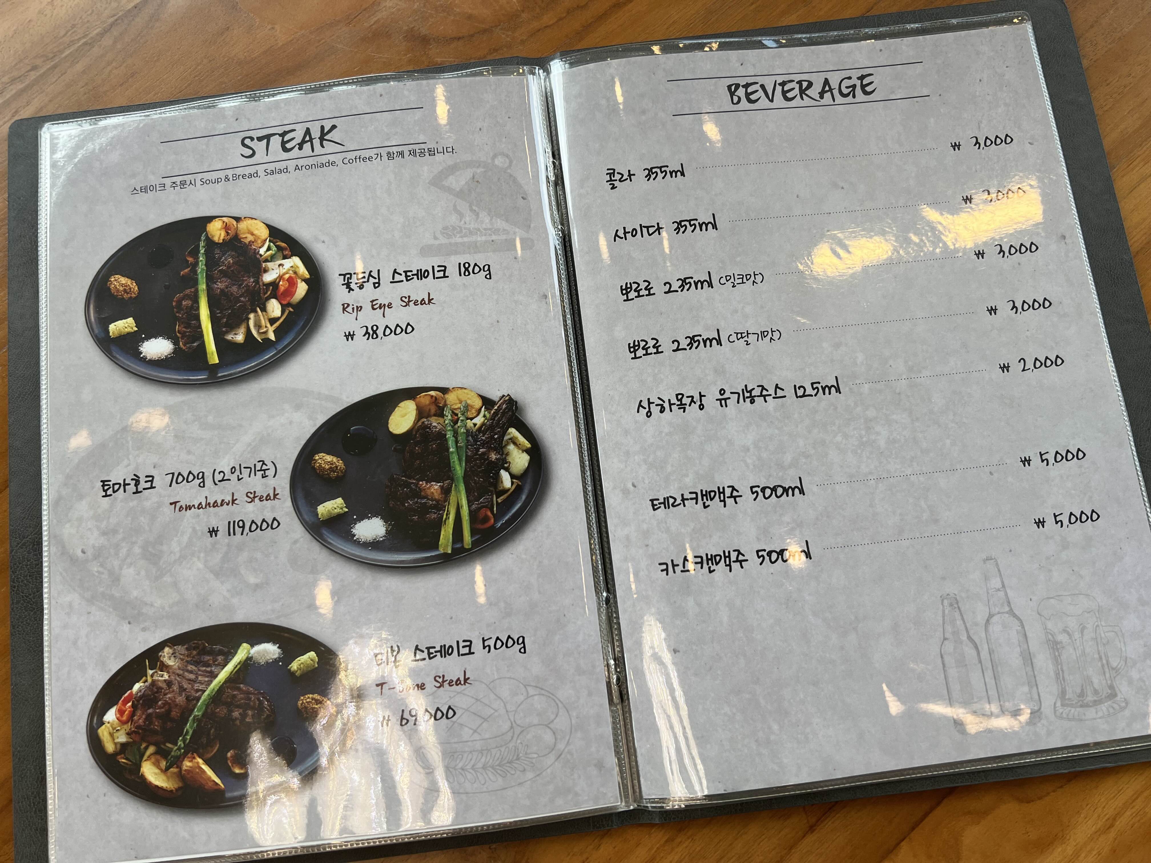 브런치, 수프, 샐러드, 파스타, 리조또, 스테이크 등 다양한 메뉴가 있습니다. 피자도 같이 주문했는데 피자는 메뉴판에는 없고 테이블 위 판넬에만 있습니다. 건물 내부 카페테리아에는 카페 메뉴가 별도로 있습니다.
