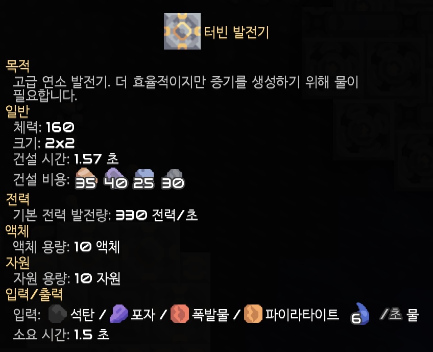 화력 발전기에 사용하던 석탄을 끌어와 터빈 발전기에 넣어줍니다. 발전량이 무려 +1.6k/s가 되었습니다..