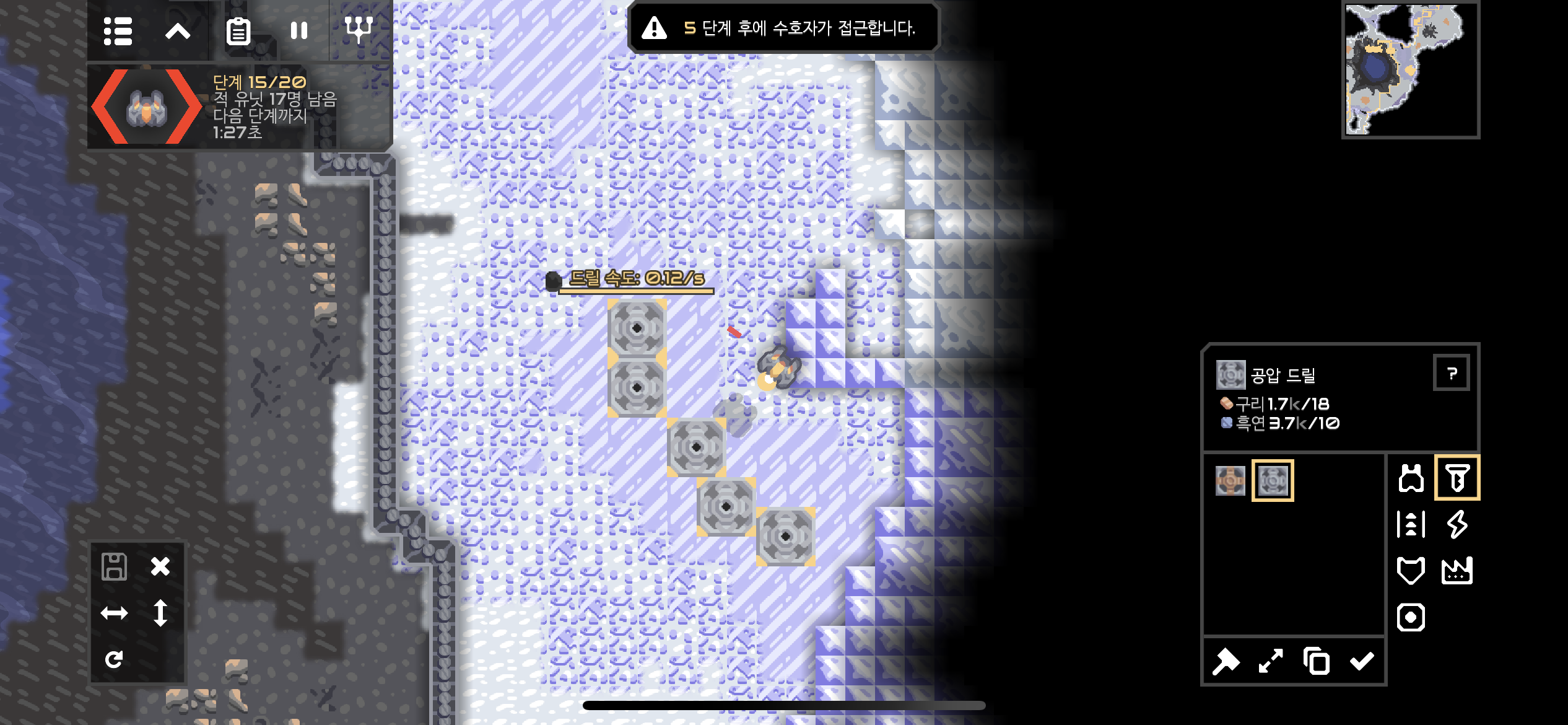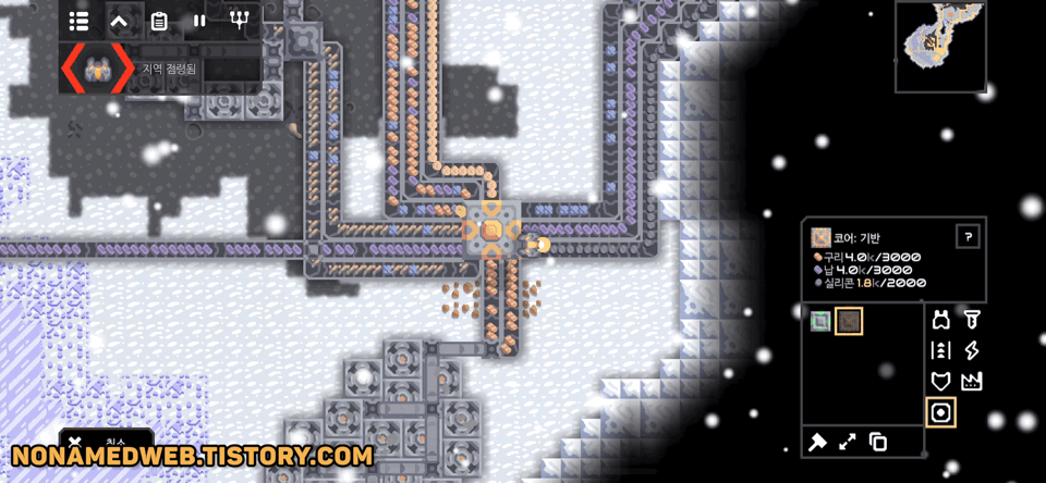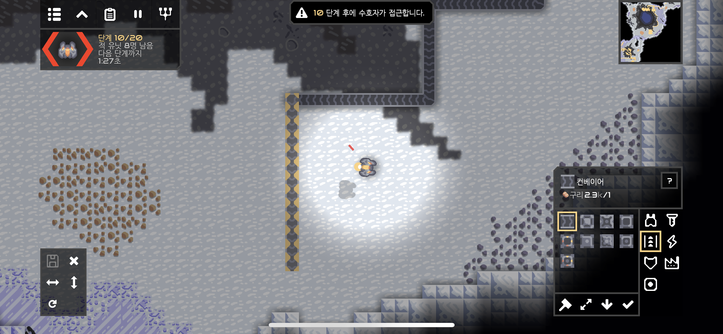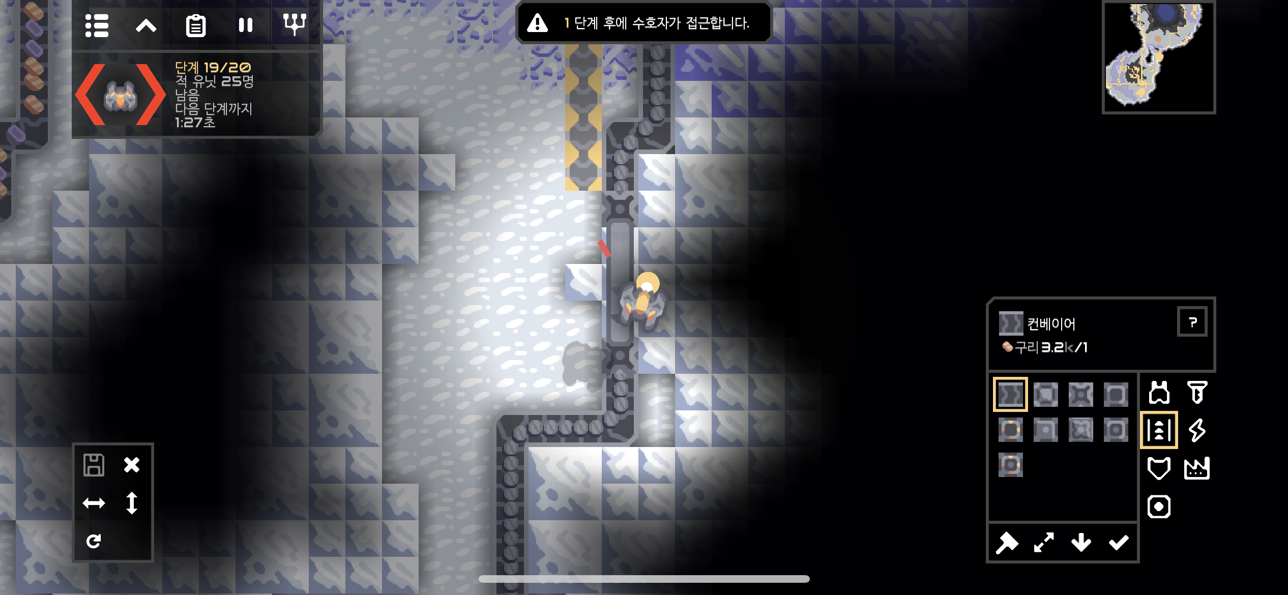실리콘을 코어로 잘 보내기위해 컨베이어를 건설하는 도중, 수호자 접근 경고! 수호자는 기존에 나오던 적 유닛보다, 티어가 조금 높은 적 유닛이라 보시면 됩니다. 일종의 보스몹 비슷한 유닛입니다.