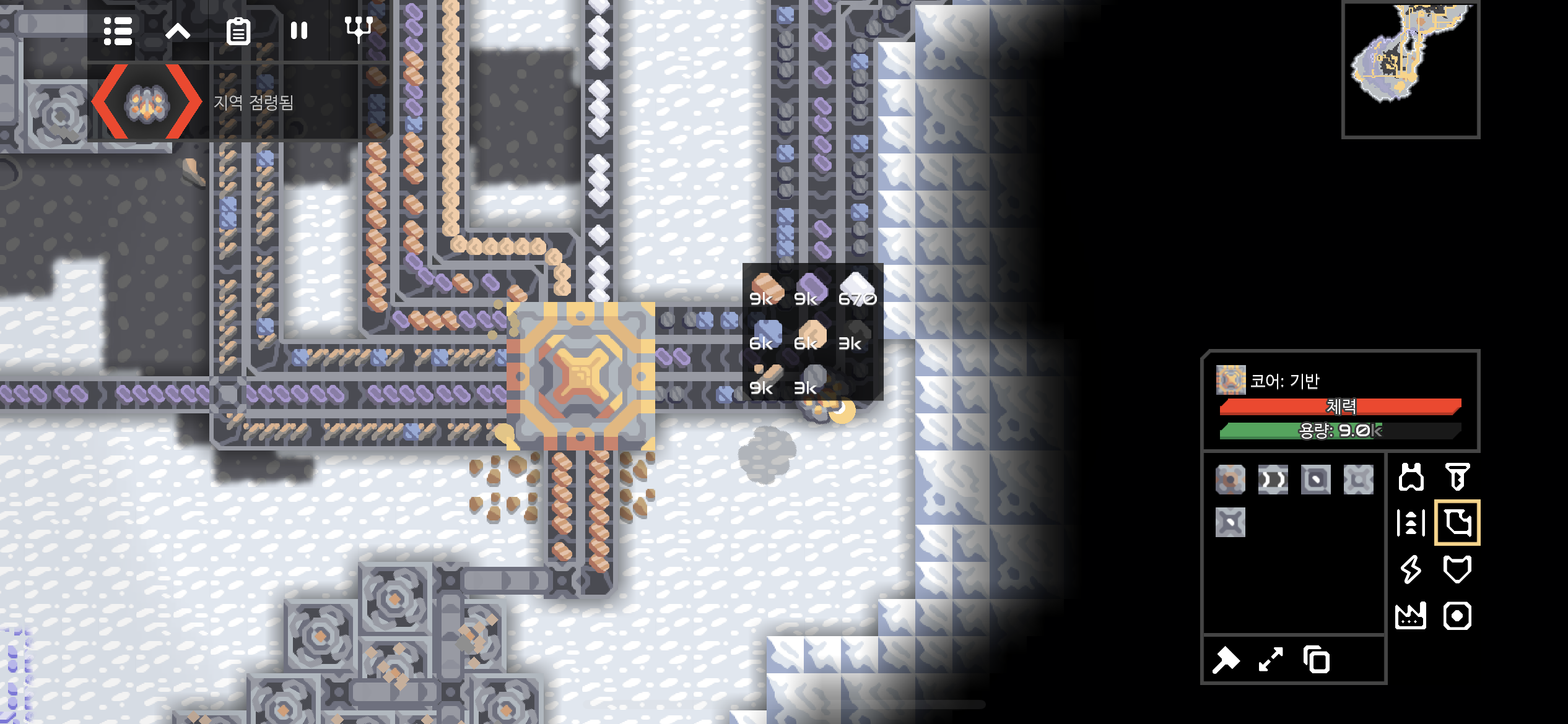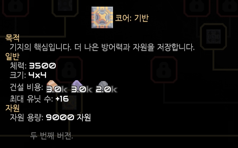 기본 코어는 자원 저장 용량이 4000이었는데 코어: 기반은 자원 저장량이 두배가 넘는 9000입니다! 어마어마하네요.. 건설 비용이 상당하지만 이외에도 체력과 크기, 최대 유닛 수 등이 모든 수치가 상당량 증가합니다.