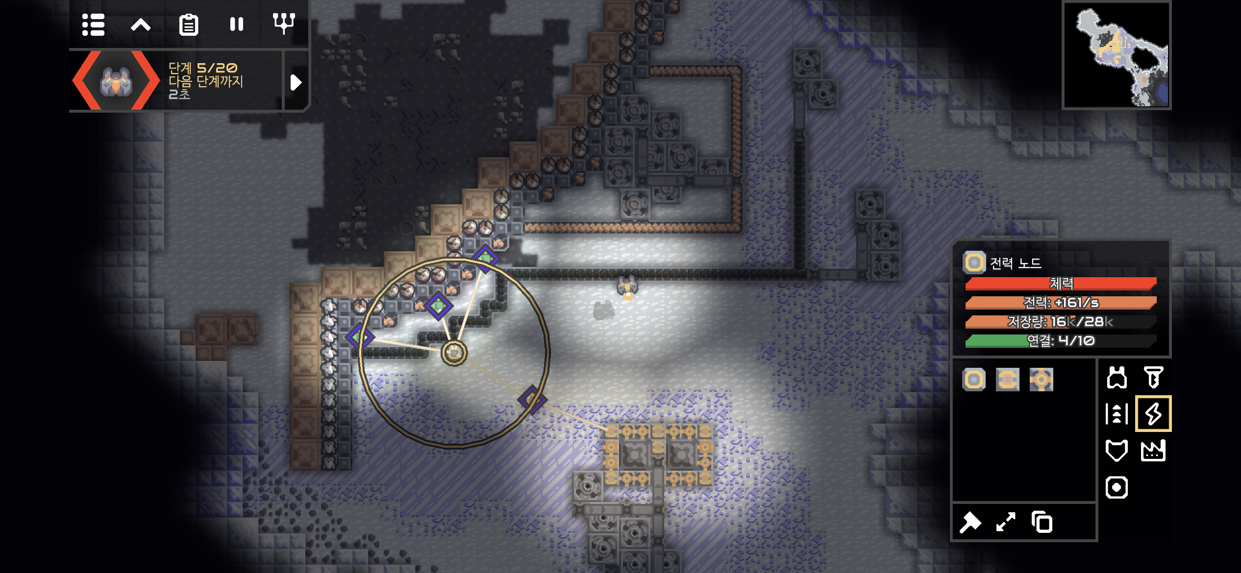 전력 노드는 전선과 같은 역할을 하는데 탭하여 현재 전력 상태를 볼 수 있습니다. 전력이 +161/s로 양호하네요.