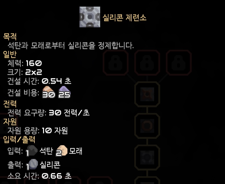 실리콘 제련소는 석탄과 모래를 이용하여 실리콘을 만들어 냅니다. 여덟개의 실리콘 제련소로 만들어진 실리콘 공장 설계도 입니다.