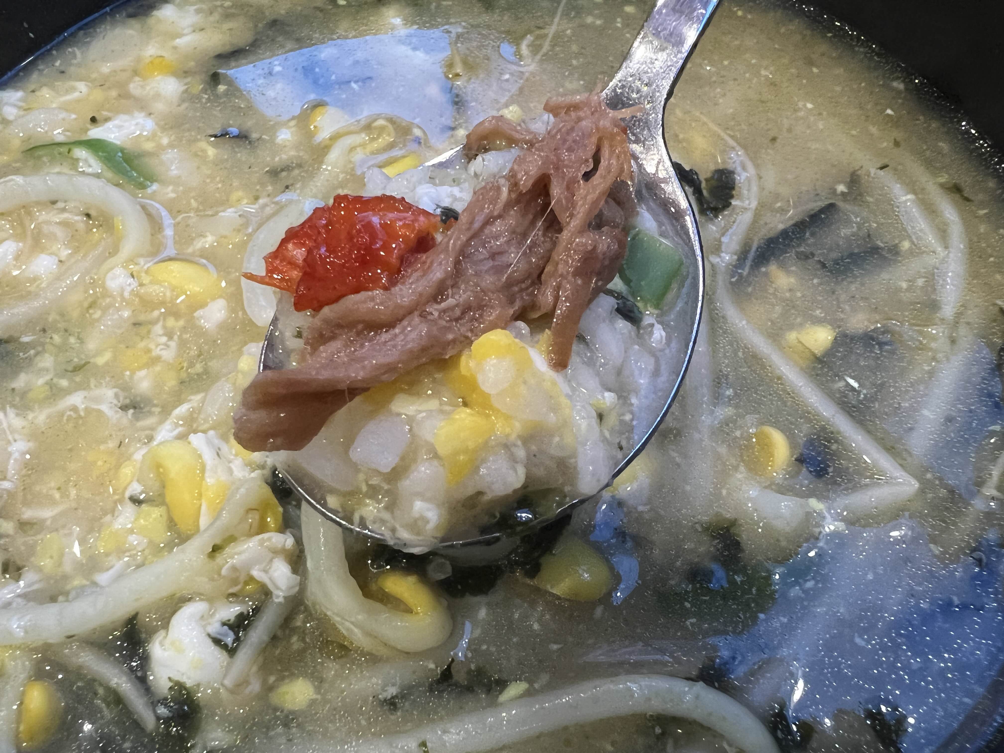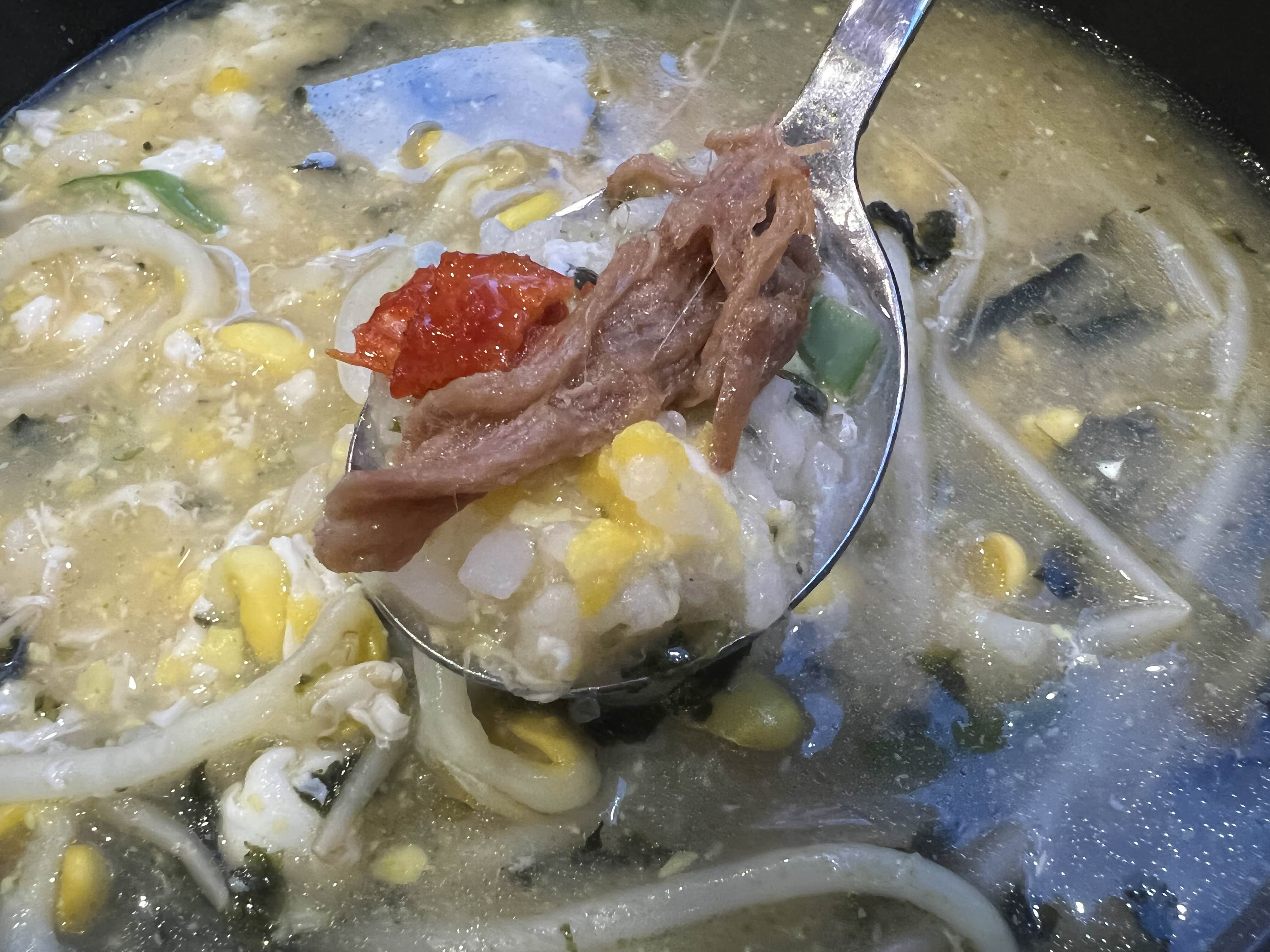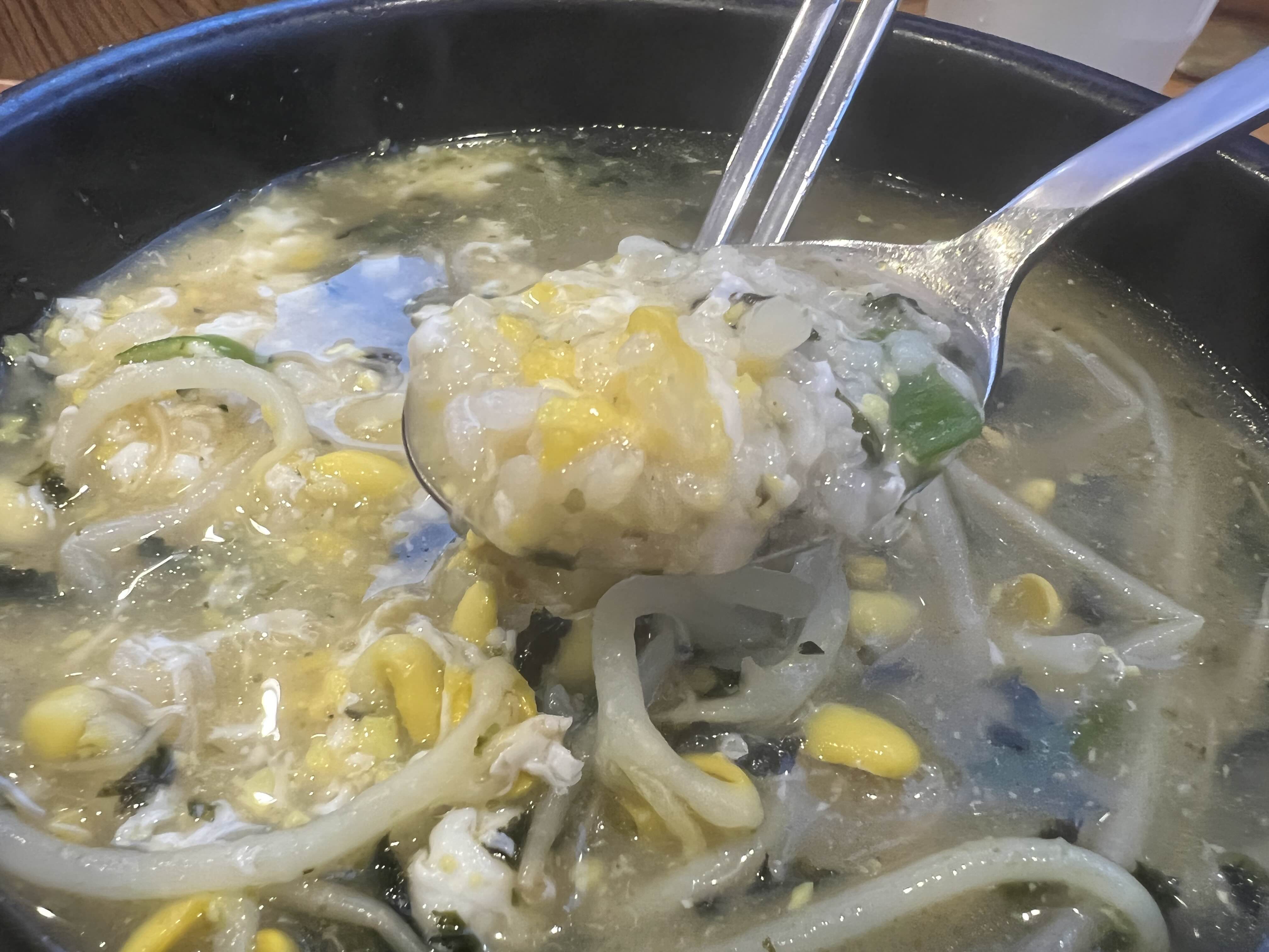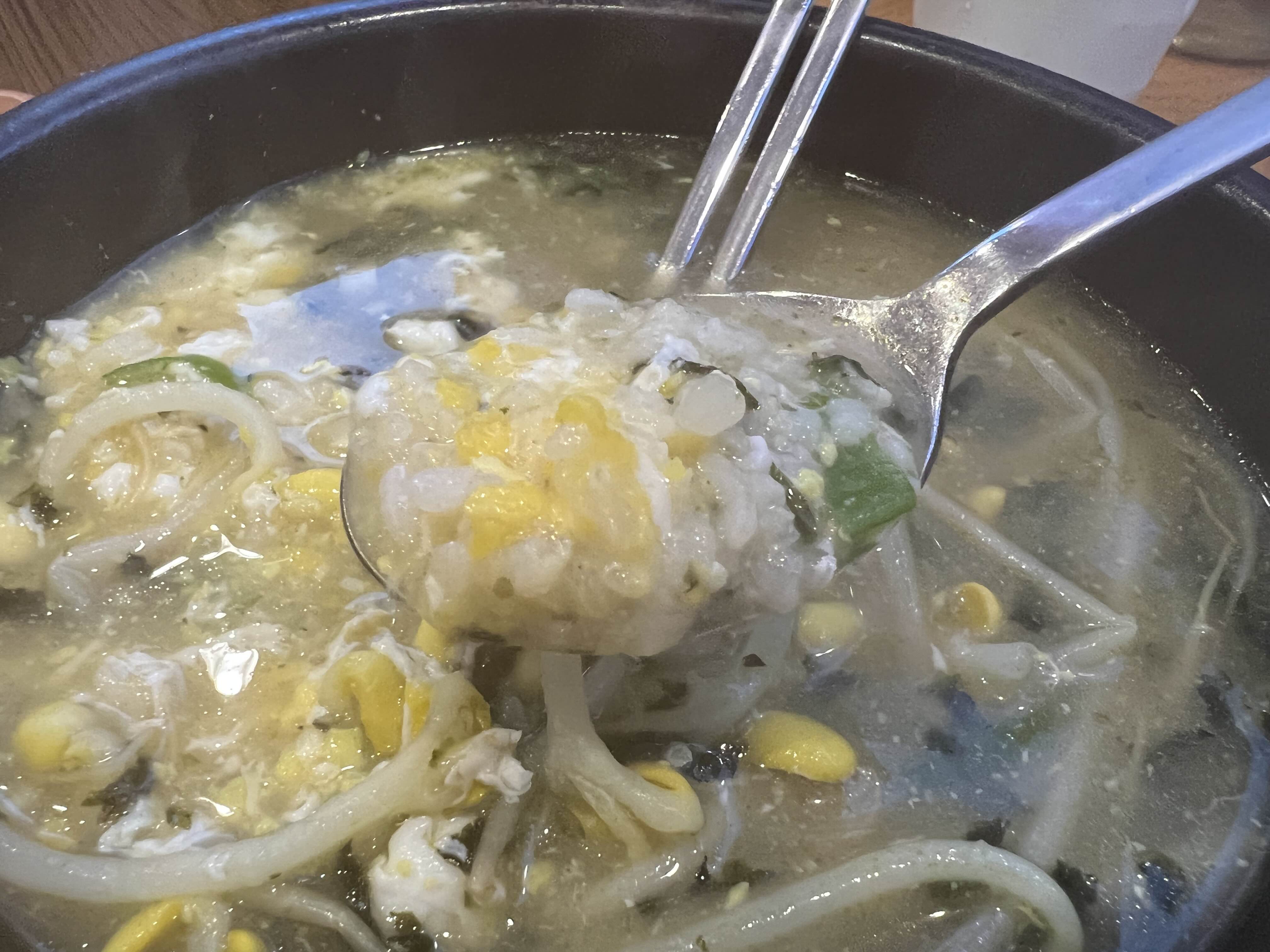 한숟깔 떠봅니다. 콩나물국밥을 뒤적이다가 수란이 터졌나보네요.. 수란 만들기는실패 ㅠ ㅠ