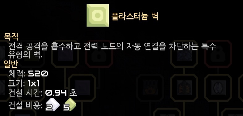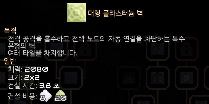 플라스터늄 벽. 전격 공격을 흡수하는 특성이 있는 벽입니다. 캠페인 난이도가 오르면 다양한 벽을 여러겹 겹쳐가며 배치해야하는 경우가 생기겠죠?