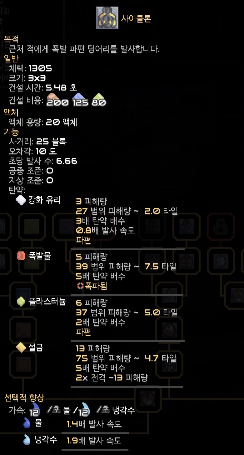 그리고 신상 터렛 사이클론. 스캐터의 상위 호환으로 보이며 지상 공격까지 가능하지만, 스캐터와 동일하게 강화 유리 탄약을 사용한다면 사거리를 제외한 모든 능력이 스캐터가 더 앞서네요.