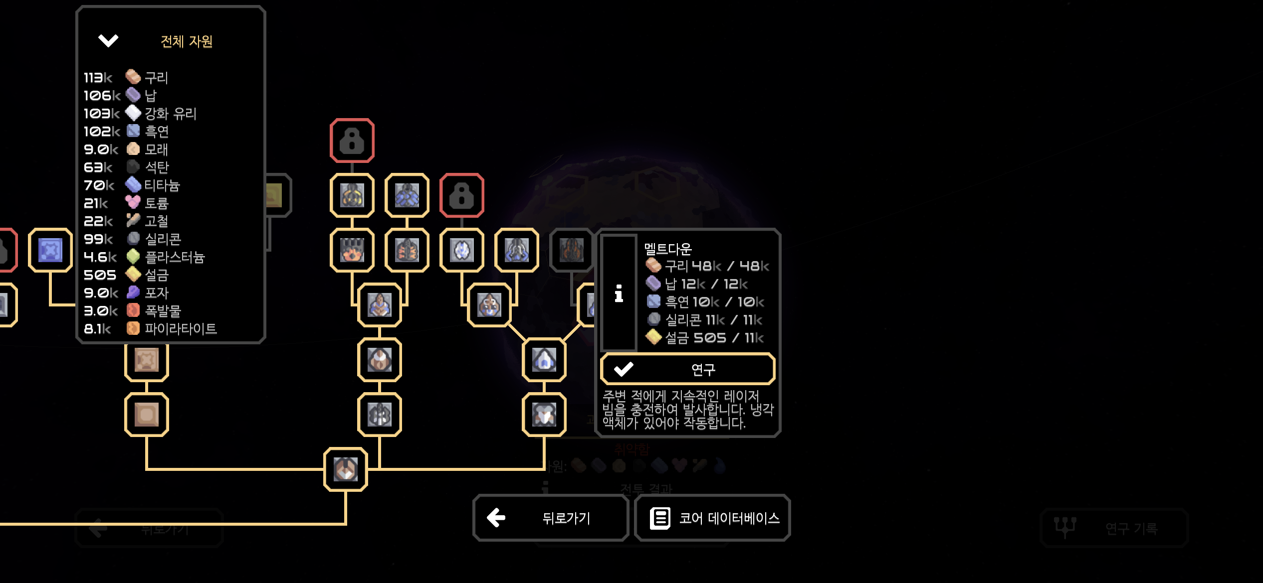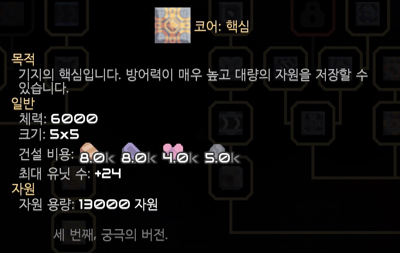 토륨으로 연구를 진행한 코어: 핵심. 궁극의 버전이라는 설명을 보니 코어의 최종 레벨인가 봅니다. 자원 용량과 함께 최대 유닛 수가 16에서 24로 대폭 늘었네요.