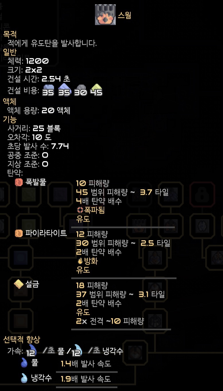 신상 터렛 스웜. 탄약의 선택이 까다로우나 모든 탄에 유도 특성이 있습니다. 지상과 공중 모두 공격이 가능하지만 범위 피해량이 있는걸로 봐서 공중 유닛을 상대할때 좀 더 효율적이려나요? 피해량보다는 범위 피해량이 더 높습니다.