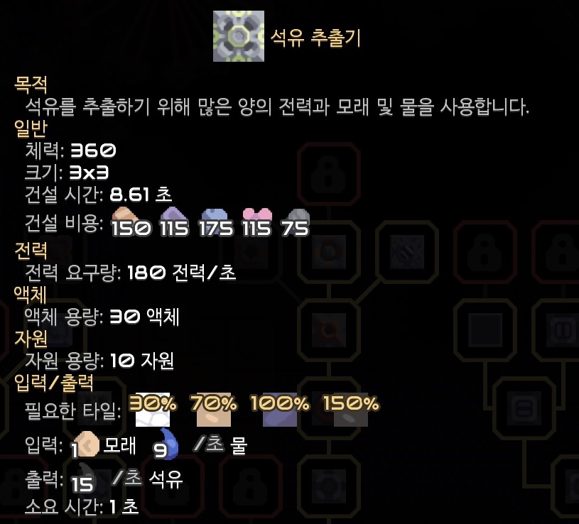 석유 추출기는 검은 모래 위에 건설시 최대 효율이 나옵니다. 석유를 생산하자 새로운 콘텐츠가 해금됩니다.