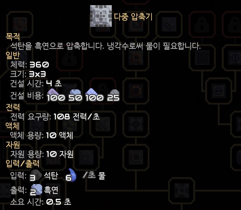 흑연 압축기의 상위 호환인 다중 압축기. 세개의 석탄으로 두개의 흑연을 만들어내지만 가동을 위해 전기와 물이 필요합니다.