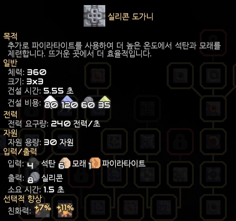 실리콘 도가니. 실리콘 제련소의 상위 호환이네요. 파이라타이트를 사용해야하고, 용암 지대로 향상이 가능합니다.