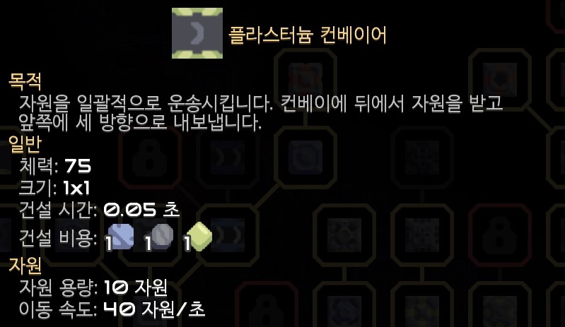 자원 이동속도가 ‘40자원/초’로 어마어마한 속도인 플라스터늄 컨베이어! 일괄적으로 자원을 운송한다고 합니다. 티타늄 컨베이어에 이어 신세계를 경험하게 해 줄듯 합니다.