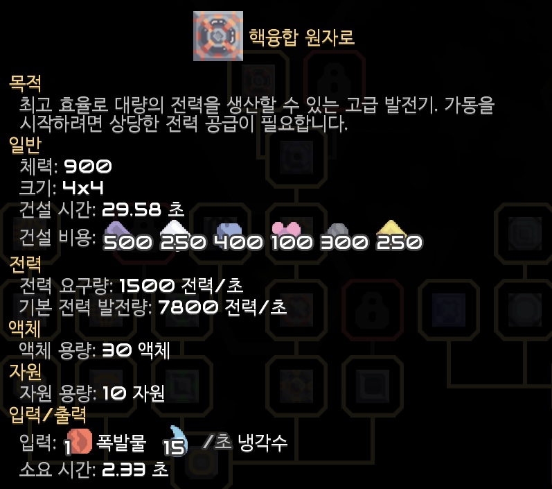 폭발물을 생산하는 폭발물 공장 설계도를 사용해 필요한 자원을 공급했습니다. 핵융합 원자로는 작동을 시작하는 단계에선 많은 전력이 필요하지만 점차 그보다 많은 전력을 만들어냅니다. 핵융합 원자로의 가동을 위해서는 전력과 폭발물 뿐만아니라 냉각수도 필요하고, 첫 가동을 위해서 많은 전력을 소모하기에 핵융합 원자로 하나를 먼저 가동한 후에 나머지를 가동합니다. 전력이 넘쳐흐르면 상관없겠지만요.