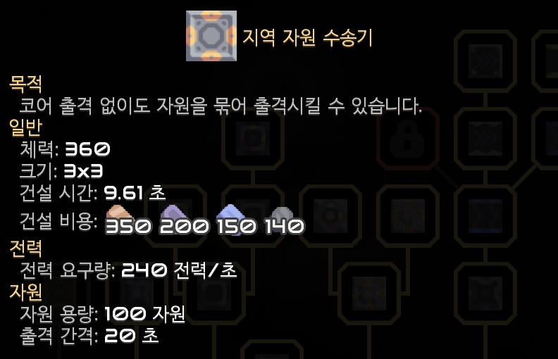 지역 자원 수송기라고 합니다. 지역 점령 후 콘텐츠가 해금되어 연구를 진행했습니다. 100개의 자원을 20초마다 출격하나 봅니다. 전력 요구량이 제법입니다.