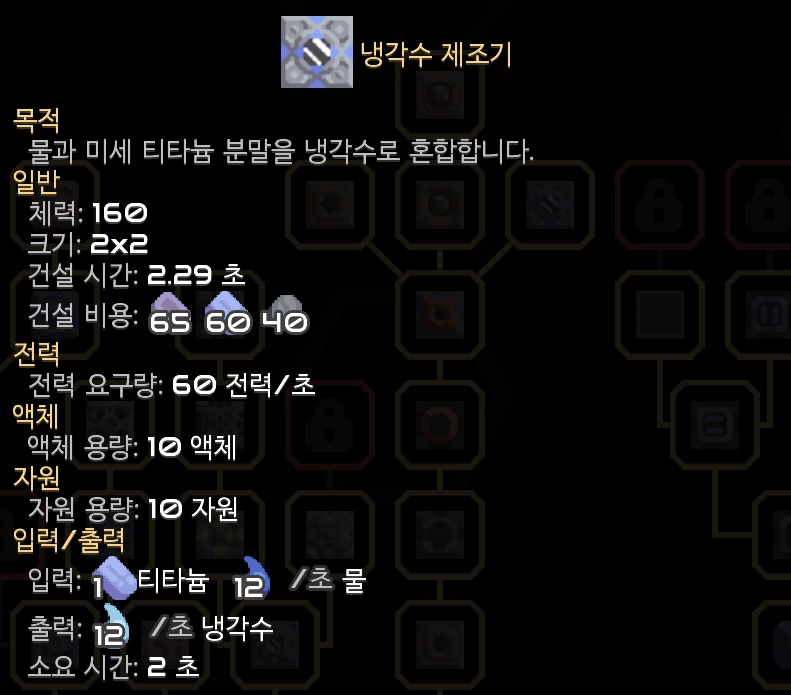 냉각수를 만들기 위해선 티타늄과 물이 필요합니다. 이 설계도에는 냉각수 제조기에 필요한 물 추출기가 포함되어있어 따로 물을 공급할 필요가 없습니다.