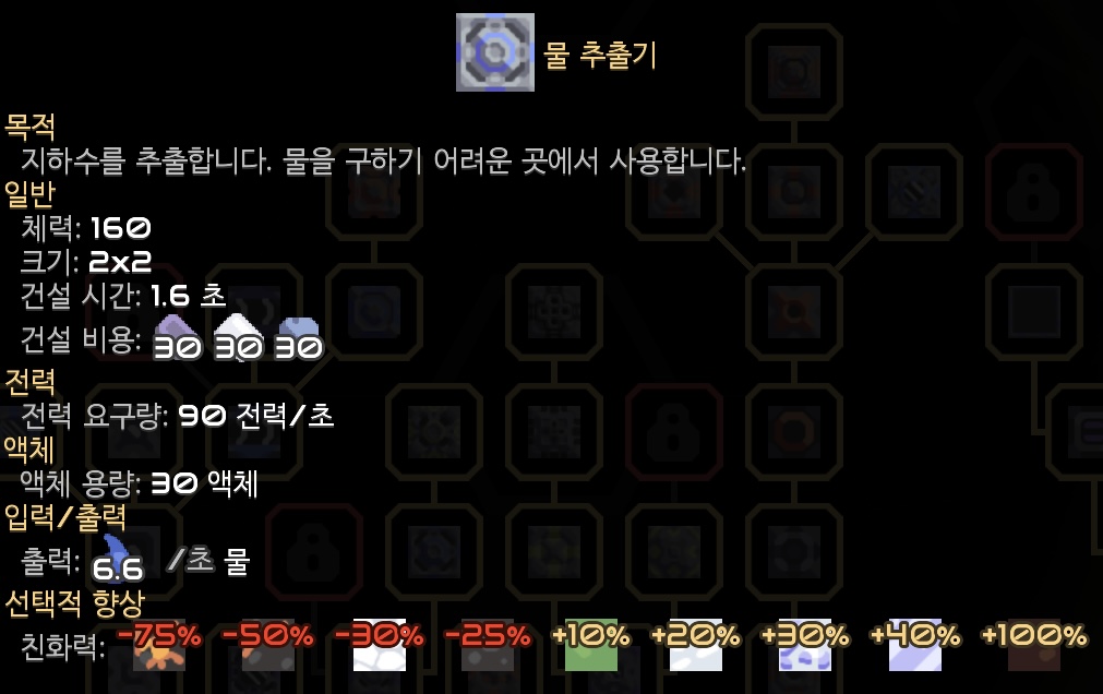 단, 물 추출기는 전력 소모가 큰 편이기에 물을 쉽게 공급할 수 있는 지역이거나 또는 전력이 여유롭지 않을 경우에는 물 추출기가 포함되어 있지 않는 다른 냉각수 공장 설계도를 사용하는게 이득입니다. 그리고 물 추출기는 지형에 따라 ‘패널티 or 보너스’가 있으니 지형을 잘 살펴 배치를 해야합니다.