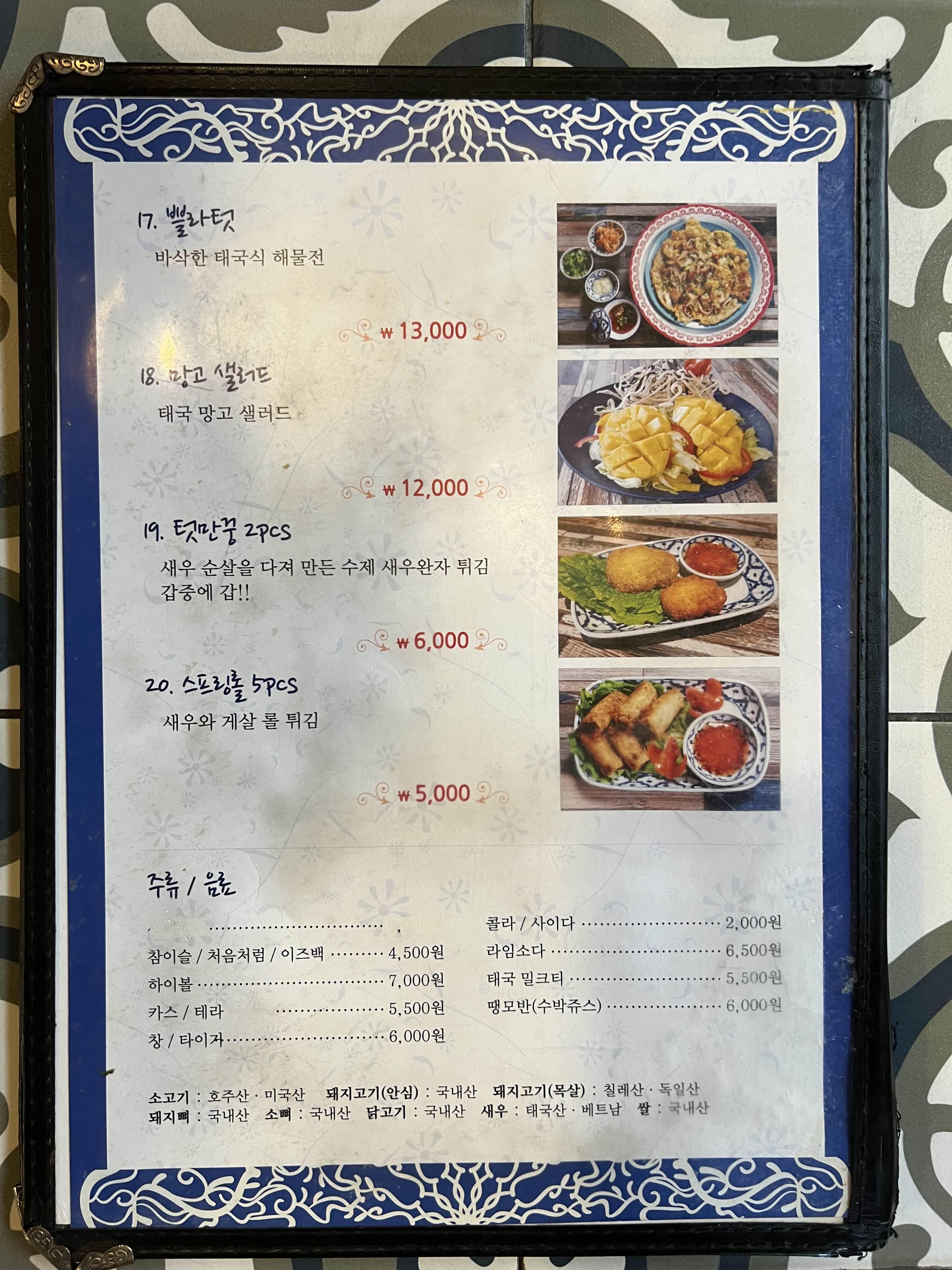 타논55 광진구의점 메뉴판. 이국적이면서도 동시에 한국적인 느낌이 물씬 나는 메뉴들 입니다. 태국이 우리와 머지 않은 나라라 식생활이 상당히 비슷한듯?