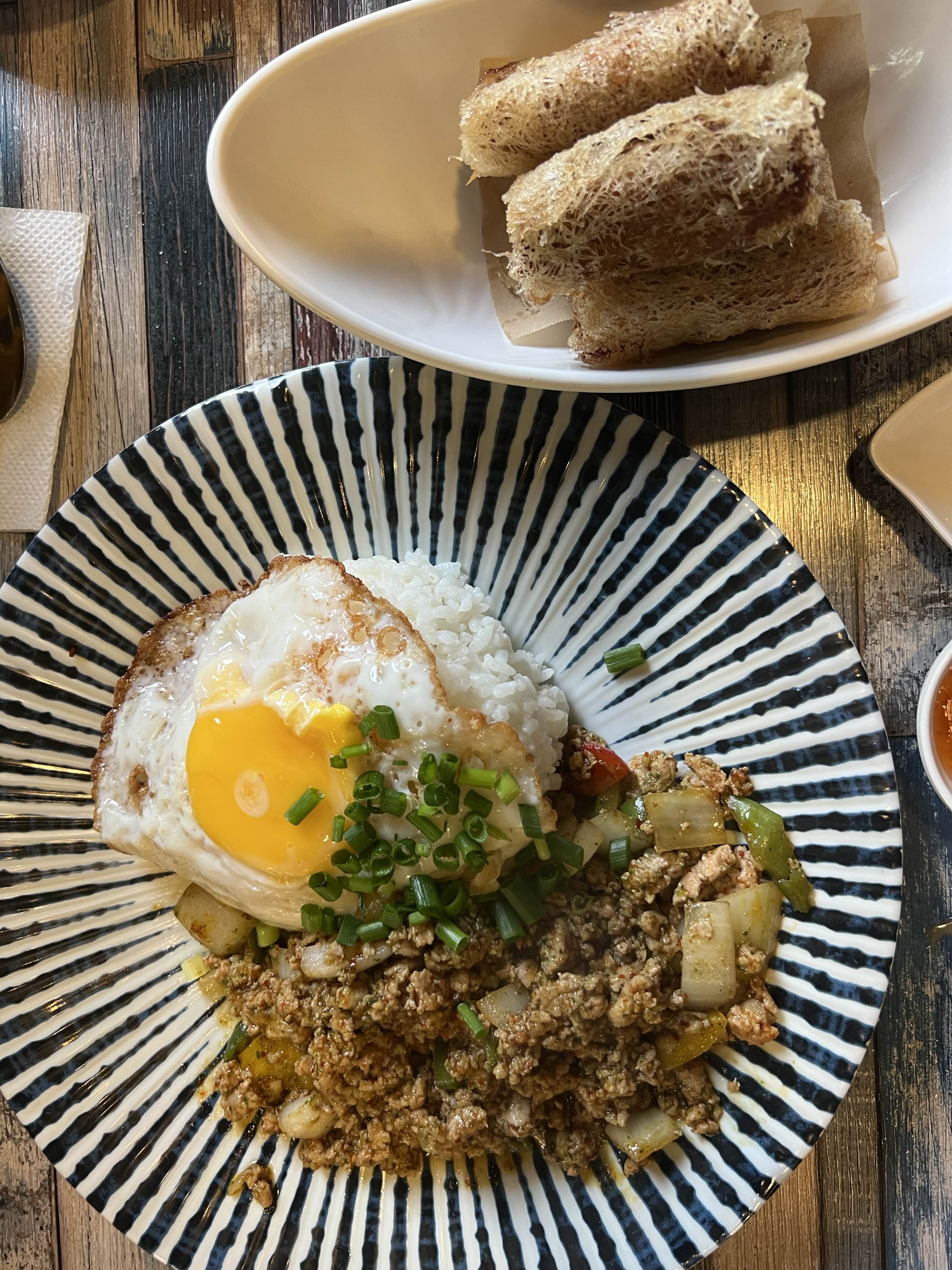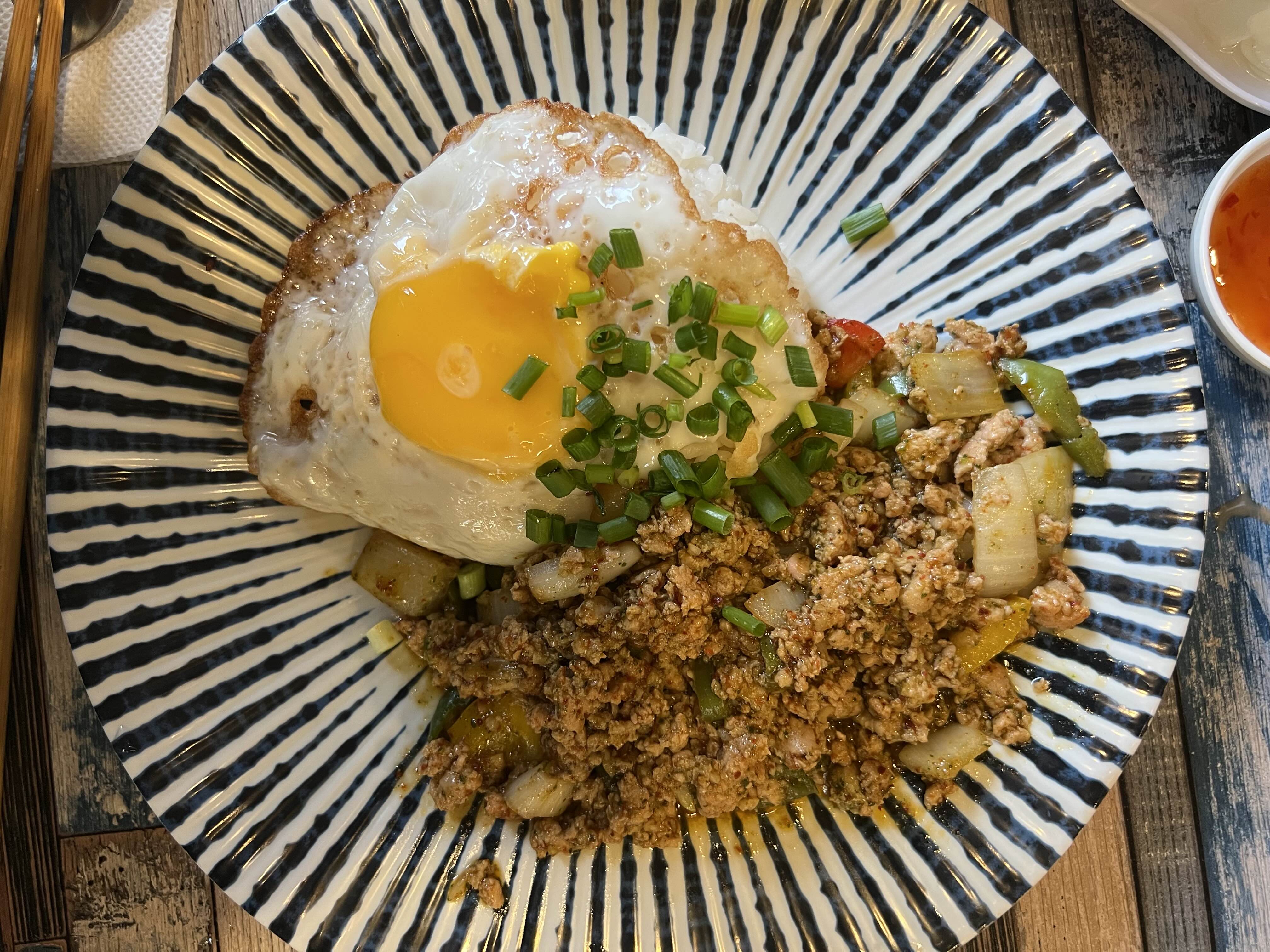 그리고 쌀국수와 함께 주문한 팟 까파오 무쌉! 우리나라 볶음밥과 비슷합니다. 돼지고기가 밥에 덮혀있는게 아니라, 사진에서 보이는 양처럼 충분히 많습니다. 덮밥의 경우 얹힌 고기의 양이 적은 경우가 많은데 밥과 비벼서 다 먹을때까지 돼지고기 볶음의 양이 충분해 너무 좋았습니다. 맵기는 조절이 가능하고, 저희는 맵지 않은 맛으로 주문했습니다. 밥의 양도 적지 않았어요!