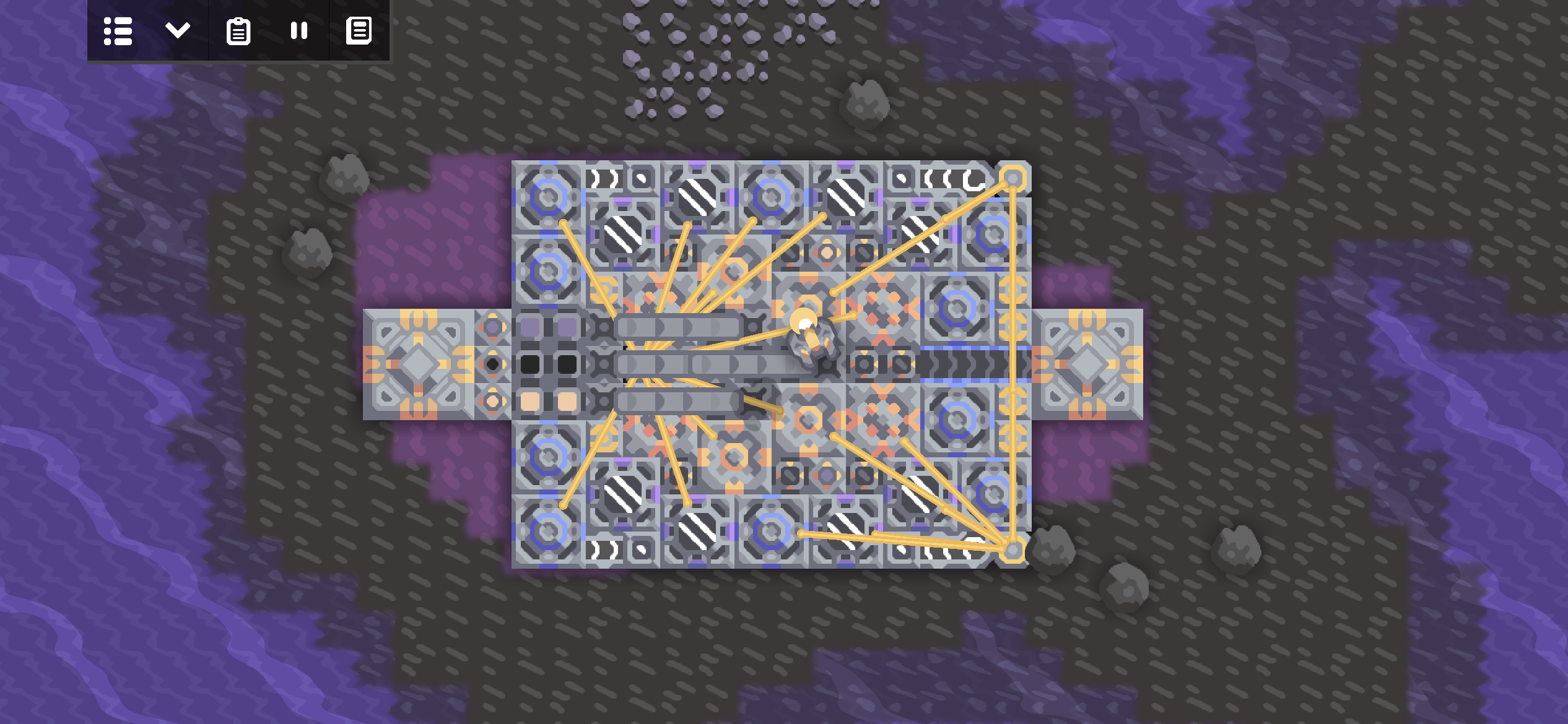이 설계도에는 파이라타이트와 포자(심지어 포자에 필요한 물까지)의 생산 시설이 포함되어있어, 언로더가 연결된 창고로 납과 석탄, 모래만 넣어주면 되기에 폭발물을 만들때 아주 편리합니다. 참 대단한 설계도입니다. 단, 편리한 만큼 전력 소모는 심한편이에요. 약 1.5k/s의 전력을 소모합니다.