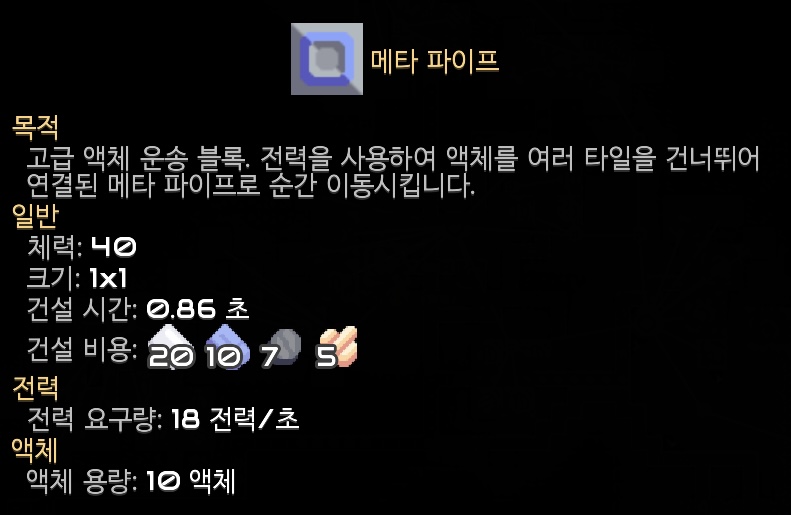 자원이나 액체를 순간이동 시키는 메타 컨베이어와 메타 파이프. 다리 컨베이어와 다리 파이프의 업그레이드 버전입니다. 기존에 사용하던 다리 구조물들은 3칸까지 뛰어넘기가 최대로 가능했는데 메타 시리즈는 10칸정도? 뛰어넘을 수 있는것 같아요.