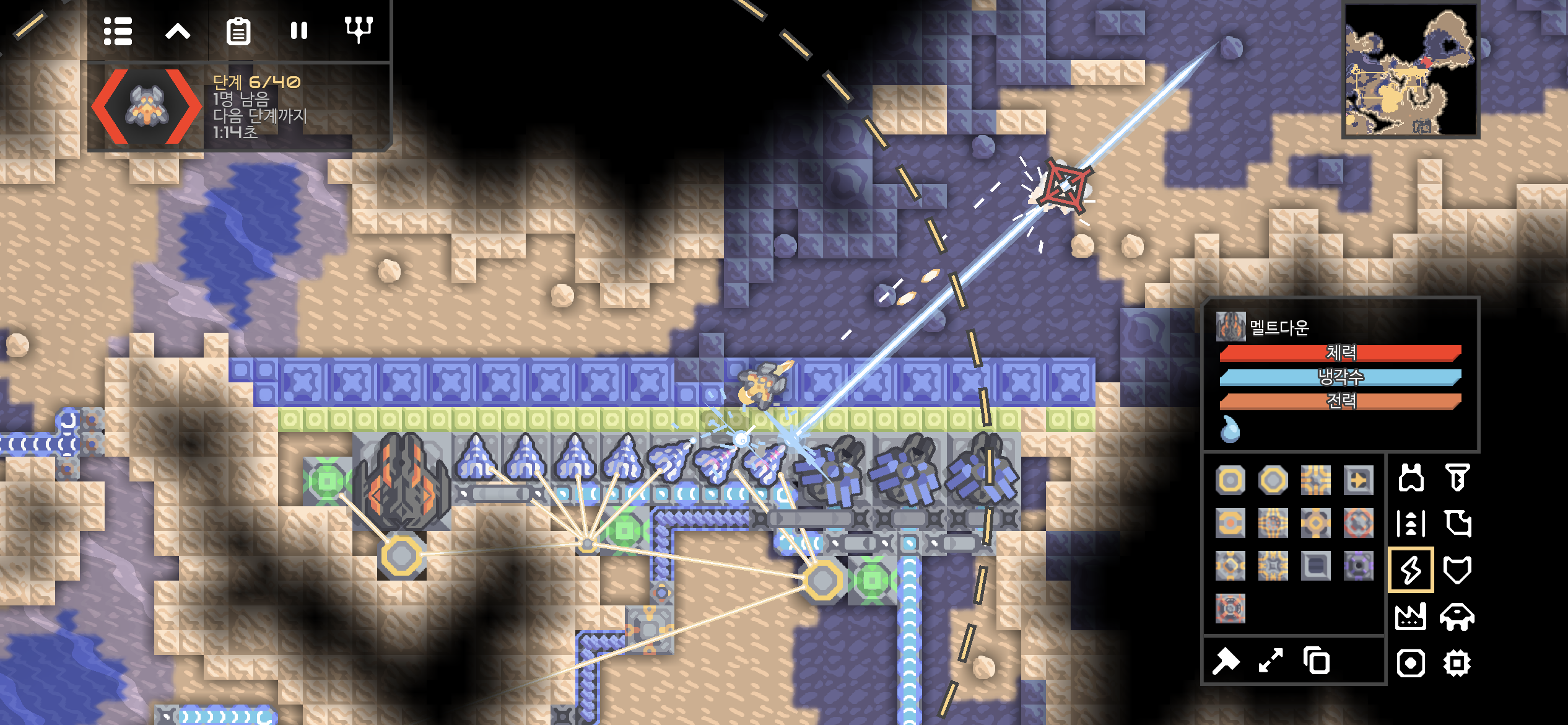 멜트다운의 화려한 레이저로 수호자가 melt & down 당했습니다. 공격력도 엄청나지만 다른 레이저 효과부터 강렬합니다. 타르 벌판 지역 점령 성공! 새로운 콘텐츠도 해금됐습니다.