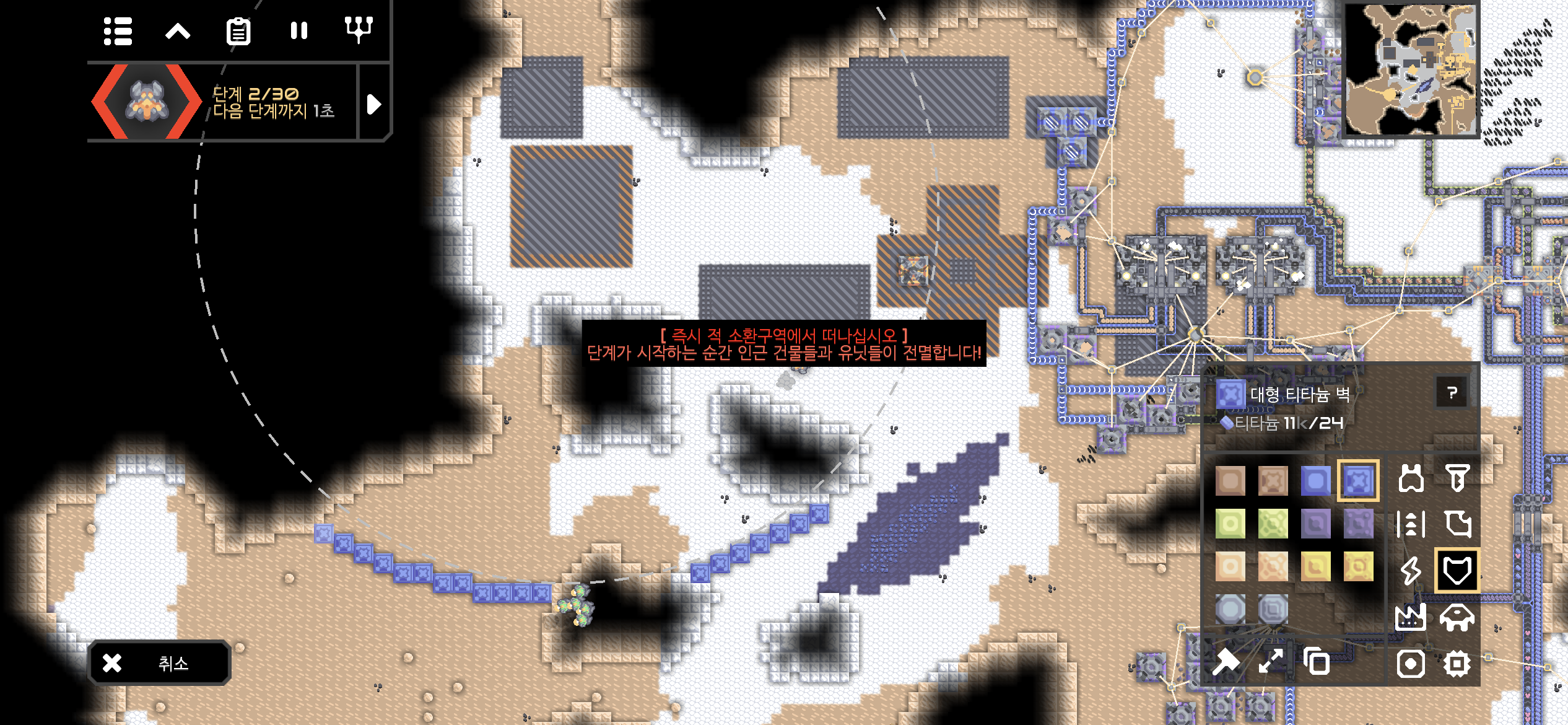 먼저 대형 티타늄 벽으로 디펜스 라인을 만들어 봅니다. 캠페인이 진행된 만큼 강한 적이 나올거라 예상되어, 적의 레이저 공격을 차단하는 플라스터늄 벽을 티타늄 벽뒤에 건설했습니다.