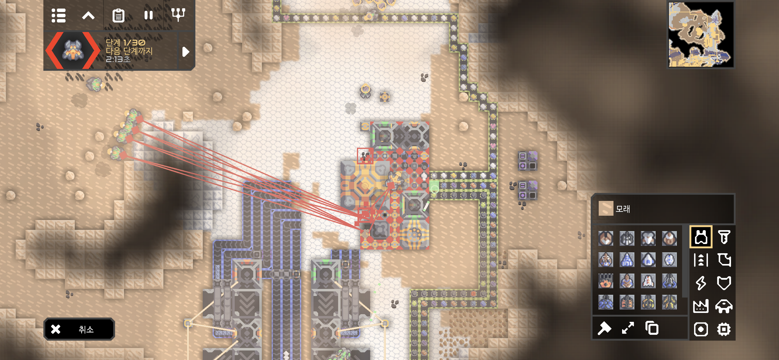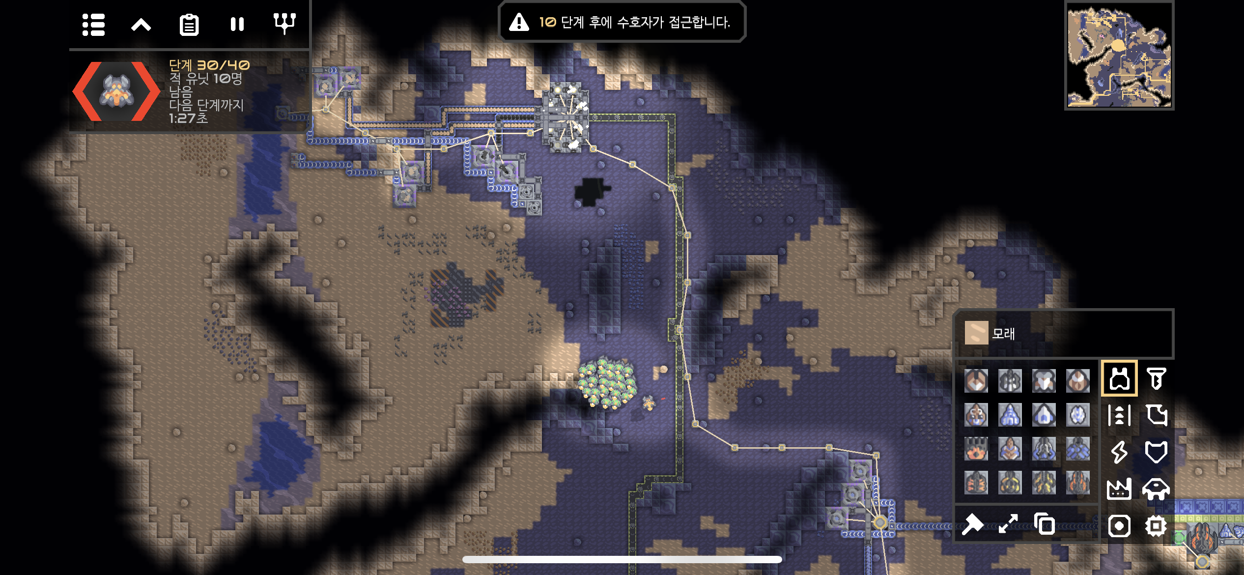 30단계까지 약한 적이 공격해옵니다. 터렛을 너무 과하게 배치했나 싶을 정도네요.