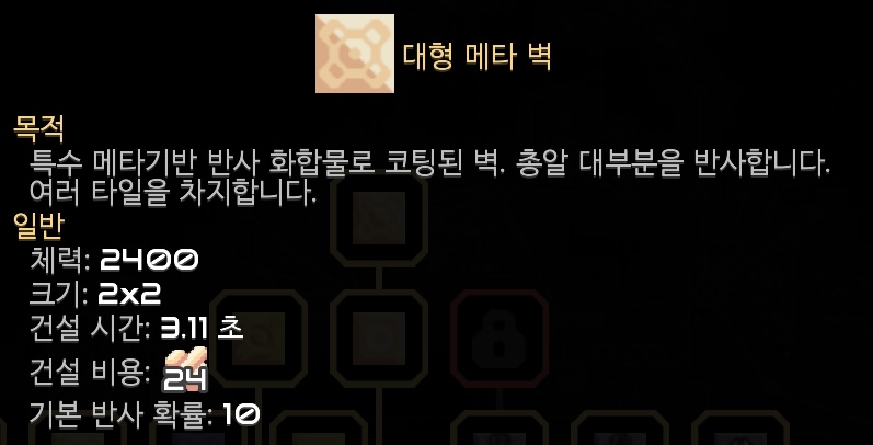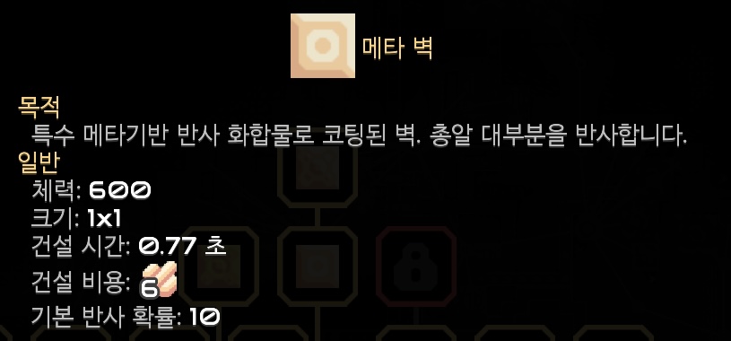 메타로도 벽을 만들 수 있네요. 플라스터늄 벽은 적의 레이저 공격을 차단하는 특성이 있는데, 메타 벽은 적의 공격을 반사하는 특성이 있네요.
