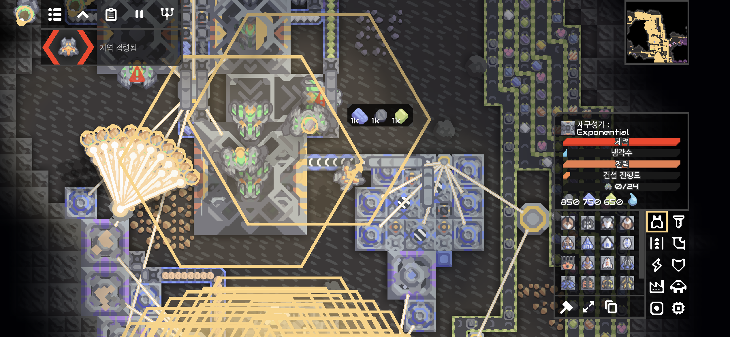 4티어 유닛을 생산할 수 있는 재구성기: Exponential. 유닛 생산을 위해 플라스터늄과 냉각수까지 공급해야 하는군요. 역시 고급 유닛은 재료 자원도 고급입니다.