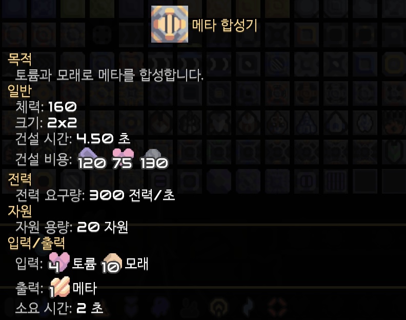 메타 하나를 만들기 위해 토륨 네개와 모래 열개가 필요합니다. 소요 시간도 2초라 시간과 자원이 정말 많이 필요해요. 설계도에 포함되어 있는 과부하 프로젝터가 연구되지 않았다면 해당 부분은 제외되고 건설됩니다.