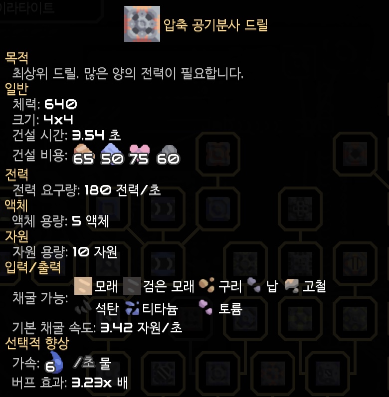 드릴의 최종 테크인 압축 공기분사 드릴입니다. 물을 공급했을때 버프 효과가 정말 크네요.