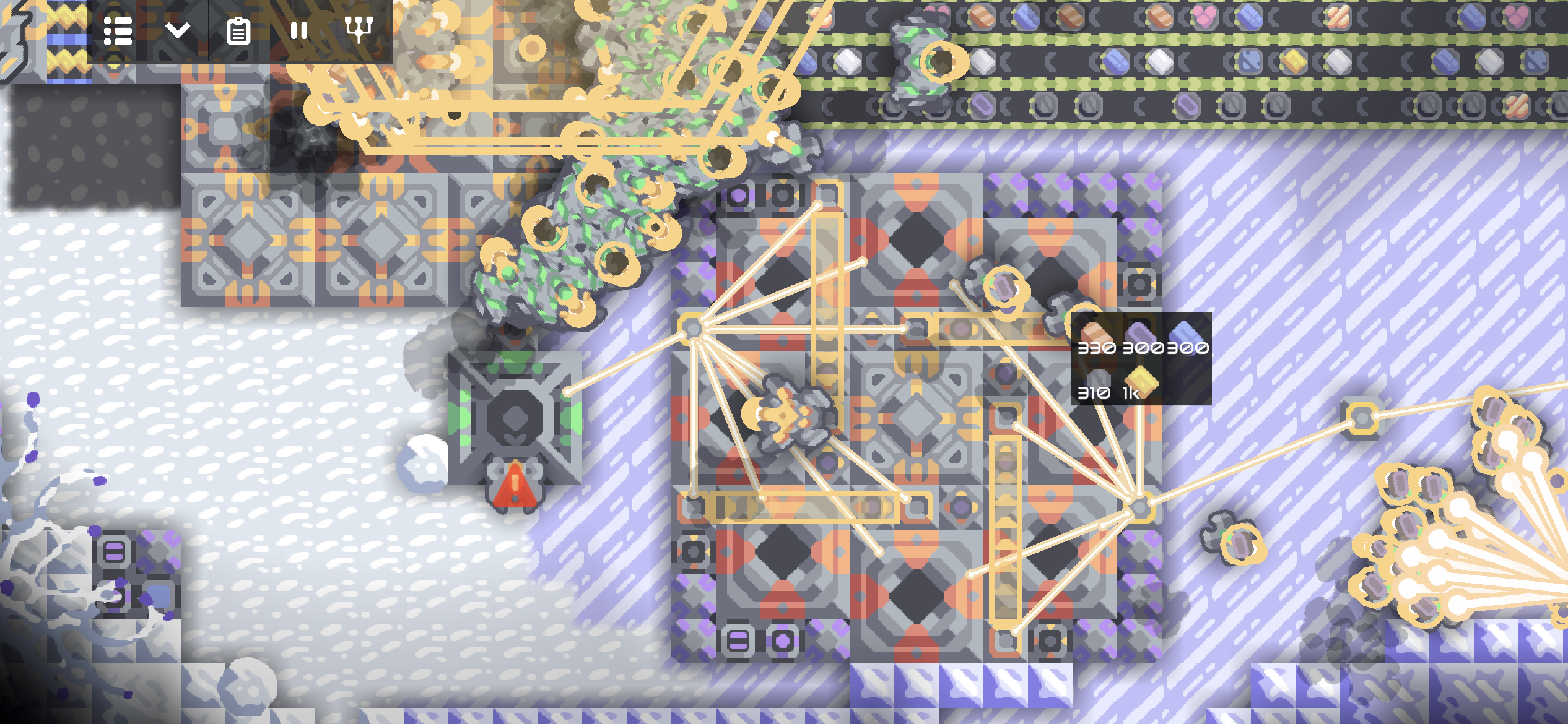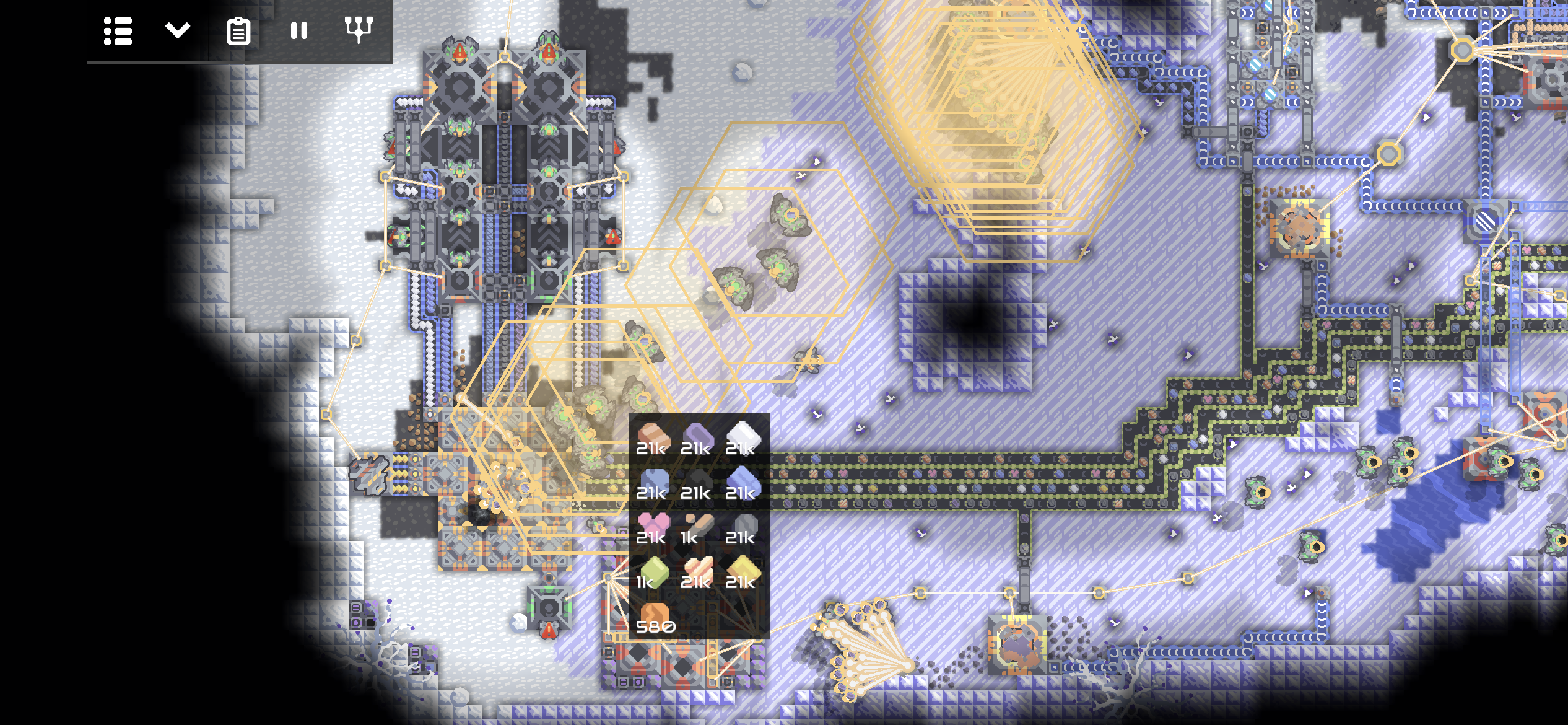 유닛 공장과 코어로 들어오는 수많은 자원들.