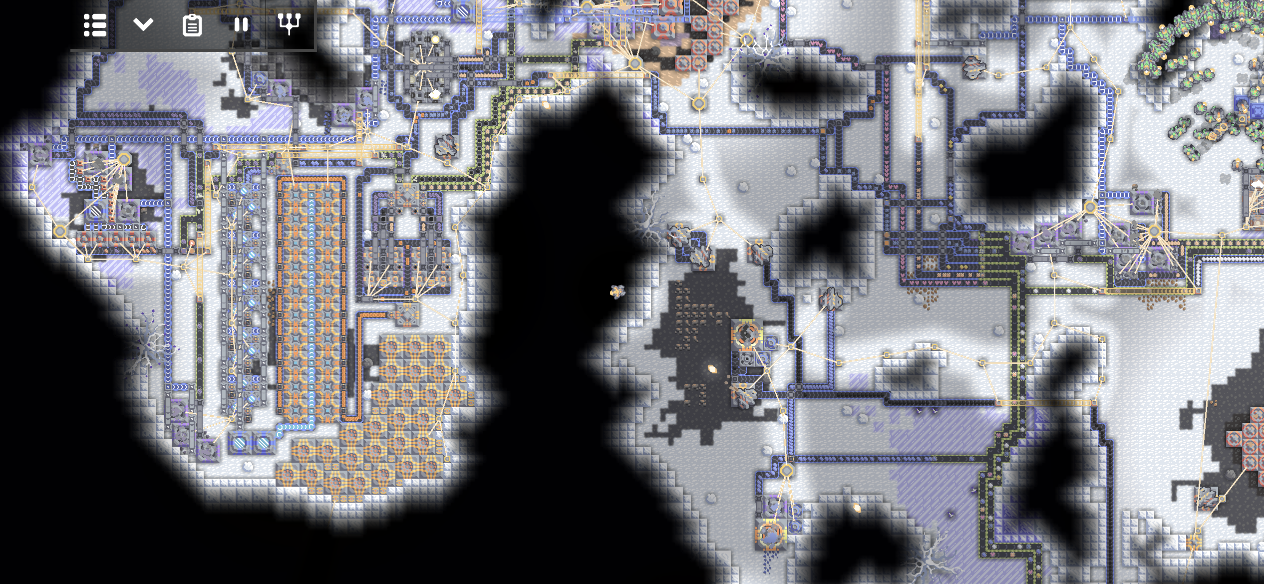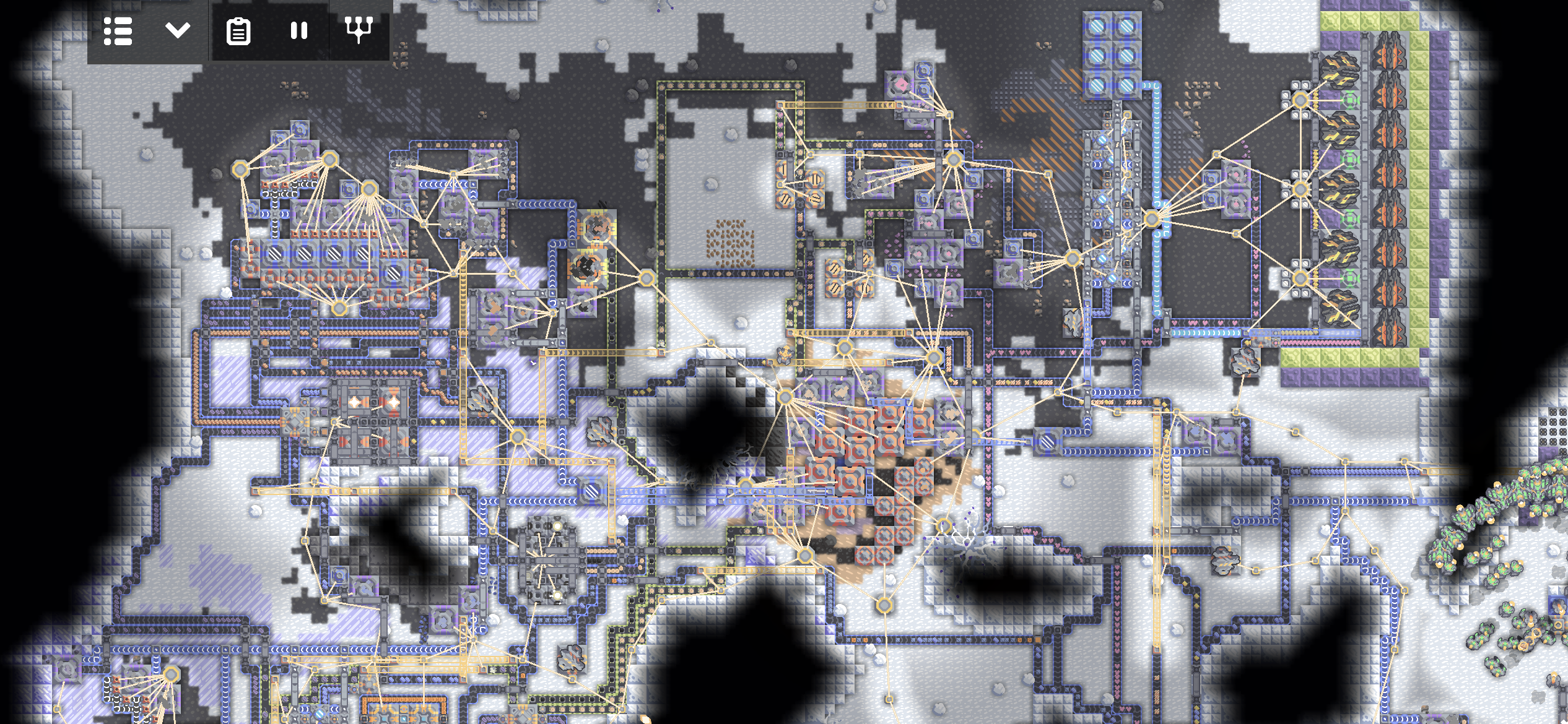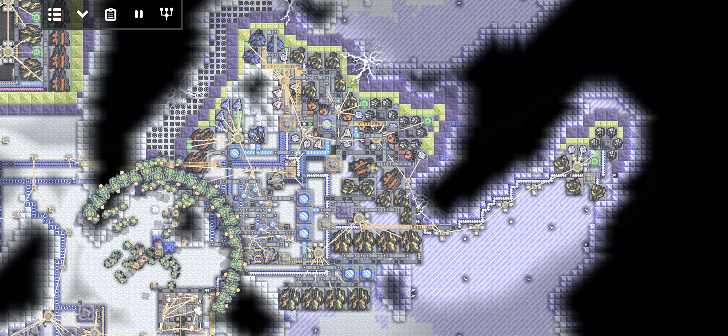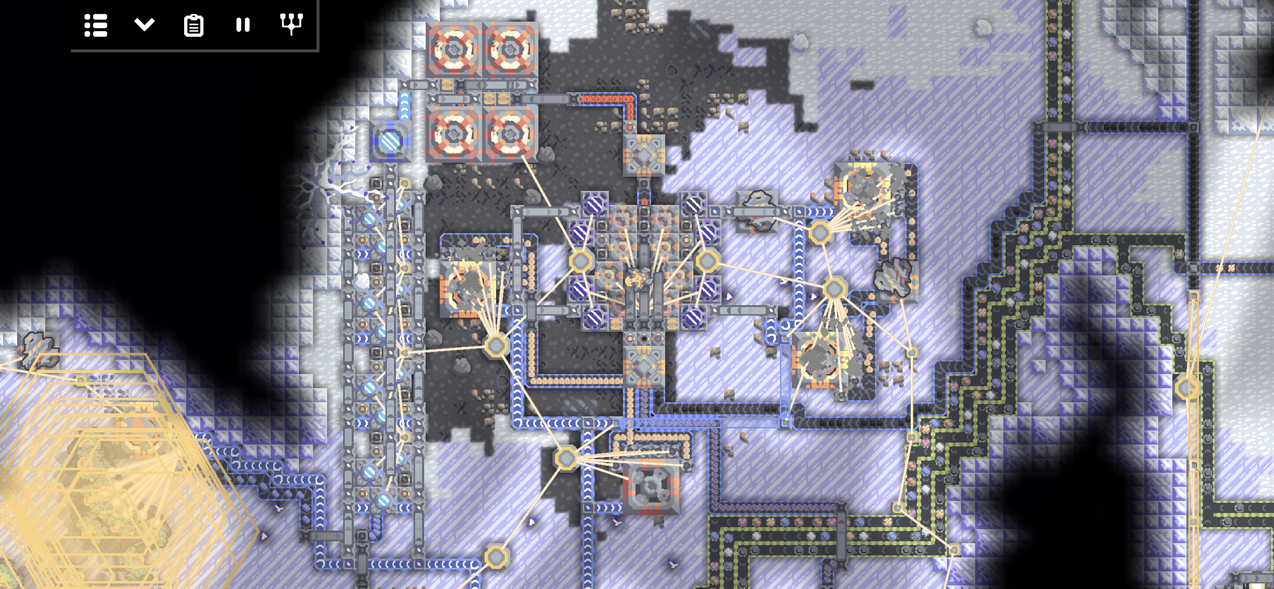 여러 시설들이 얽히고설켜 있습니다. 특이한 점이 있다면, 핵 생산 단지는 납이 부족한 지역이라 광재 분리기를 이용해 납을 생산하고 있습니다. 설금 공장, 메타 공장, 실리콘 공장이 보이네요.