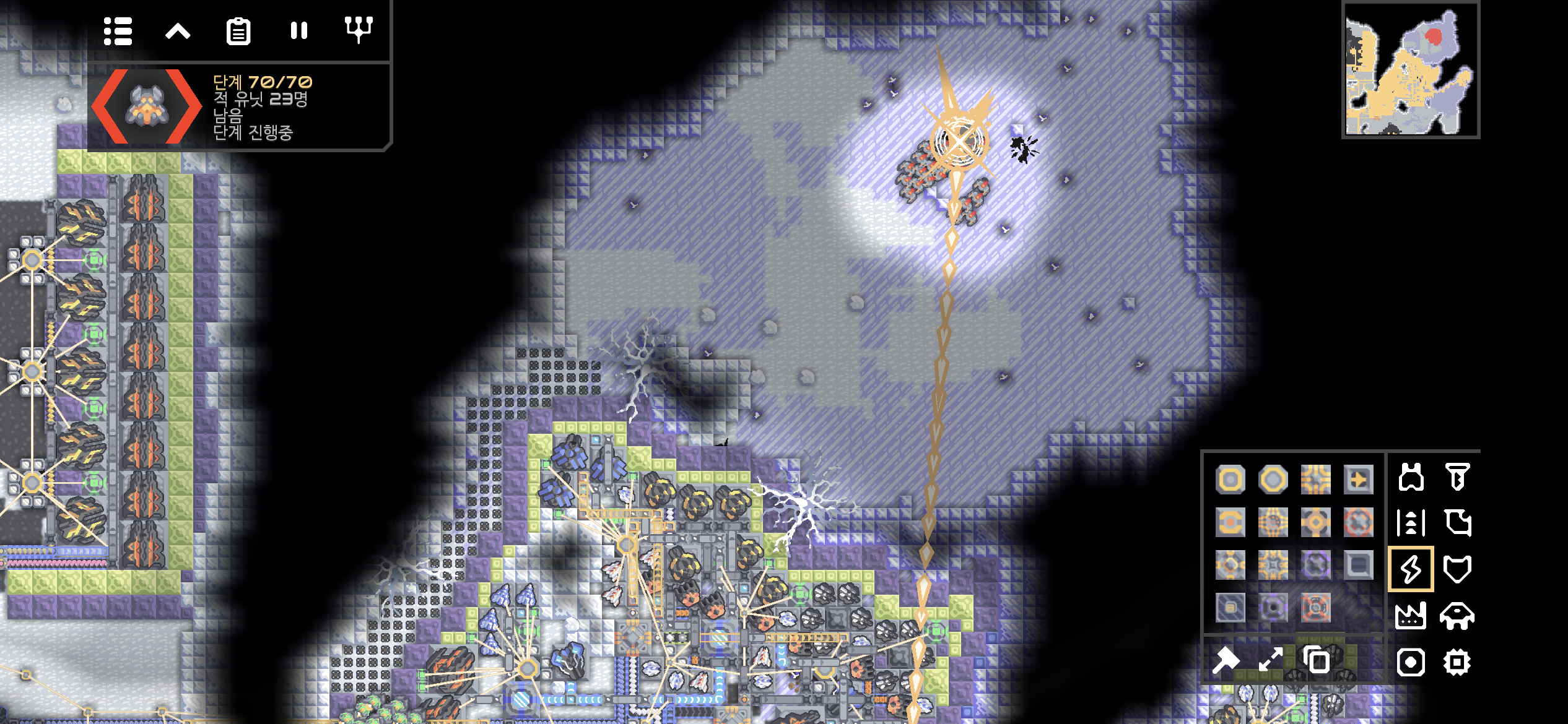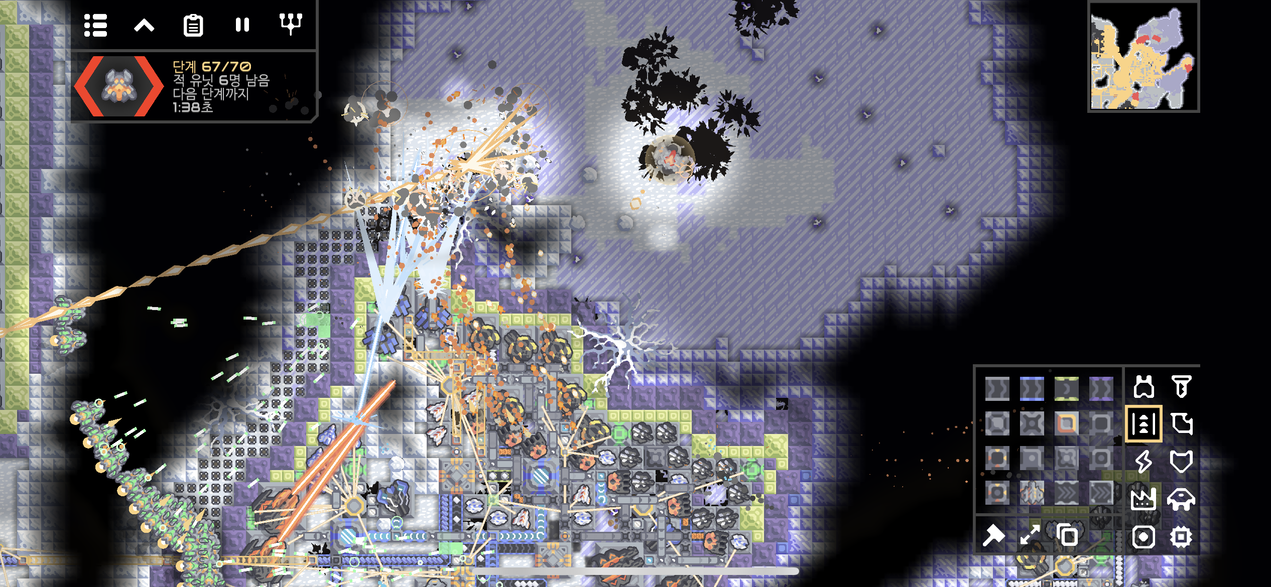여러 시설들을 증설하고 점검하던 중 또다시 시작된 적의 공격!! 이번엔 무려 70단계까지 진행될 예정입니다.