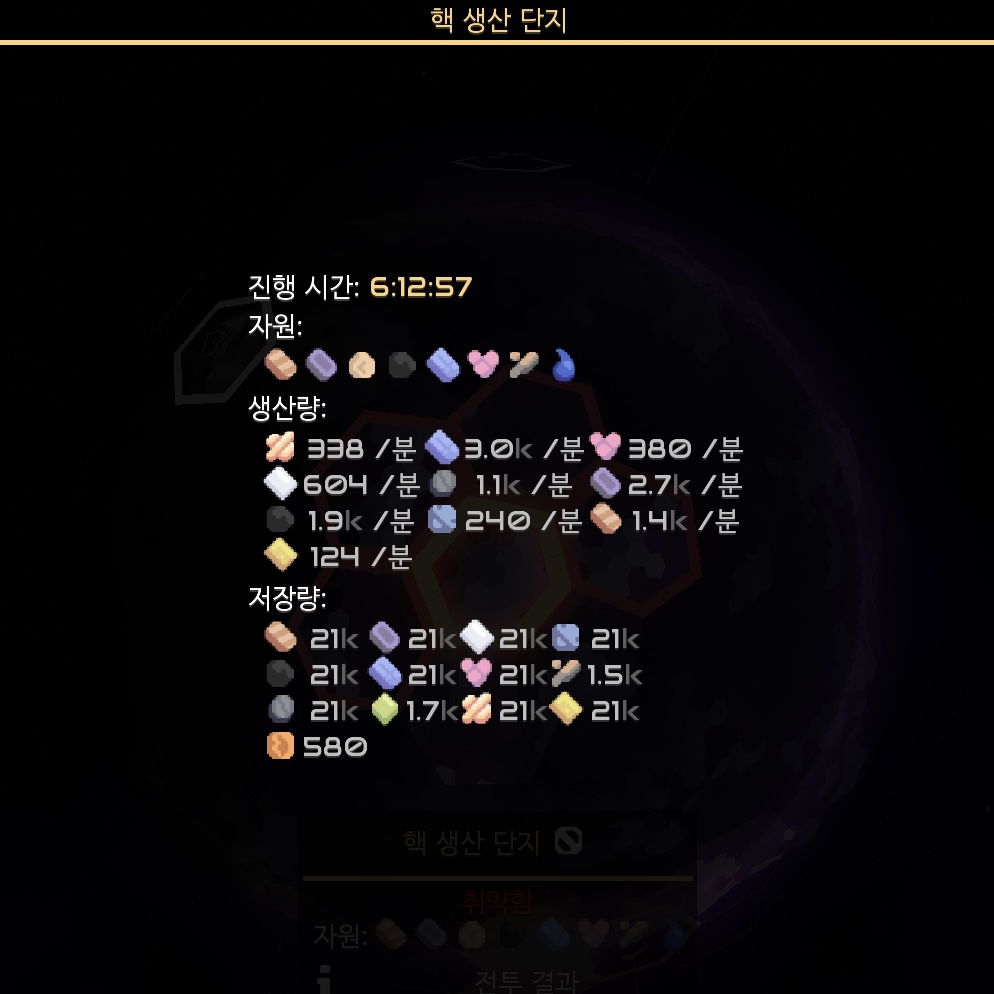 핵 생산 단지 점령 레포트~ 설금의 실제 생산량은 더 많을텐데, 프로세서 공장이 멈춰 있으니 생산량에 집계가 되지 않는듯 합니다. 그리고 석유를 만들어낼 지형이 없어 플라스터늄의 생산이 불가한 점이 좀 아쉽네요.