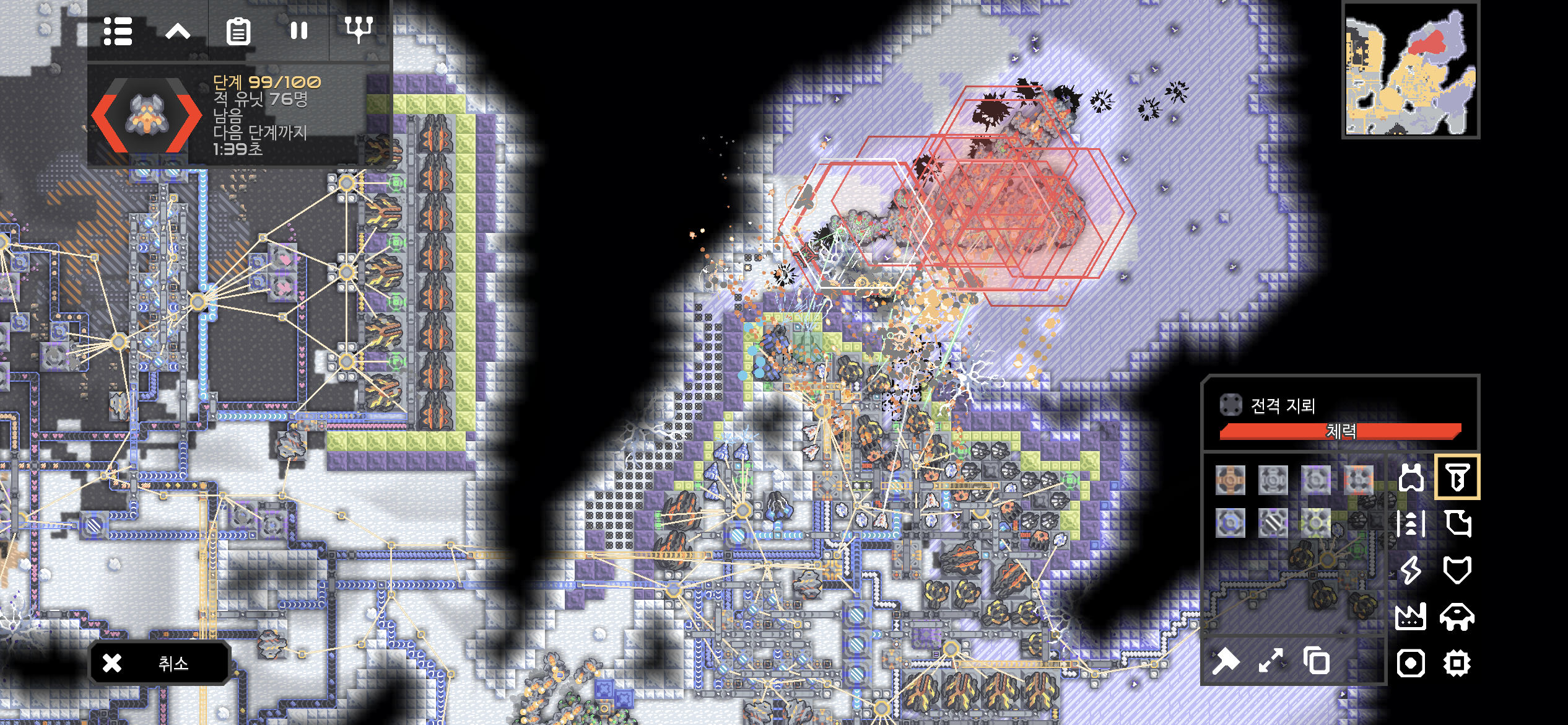 지역의 공장과 시설을 증설하는 중에 핵 생산 단지가 다시 공격받아 잠시 다녀왔습니다. 핵 생산 단지는 현재 100단계까지 적을 막아내고 있습니다.