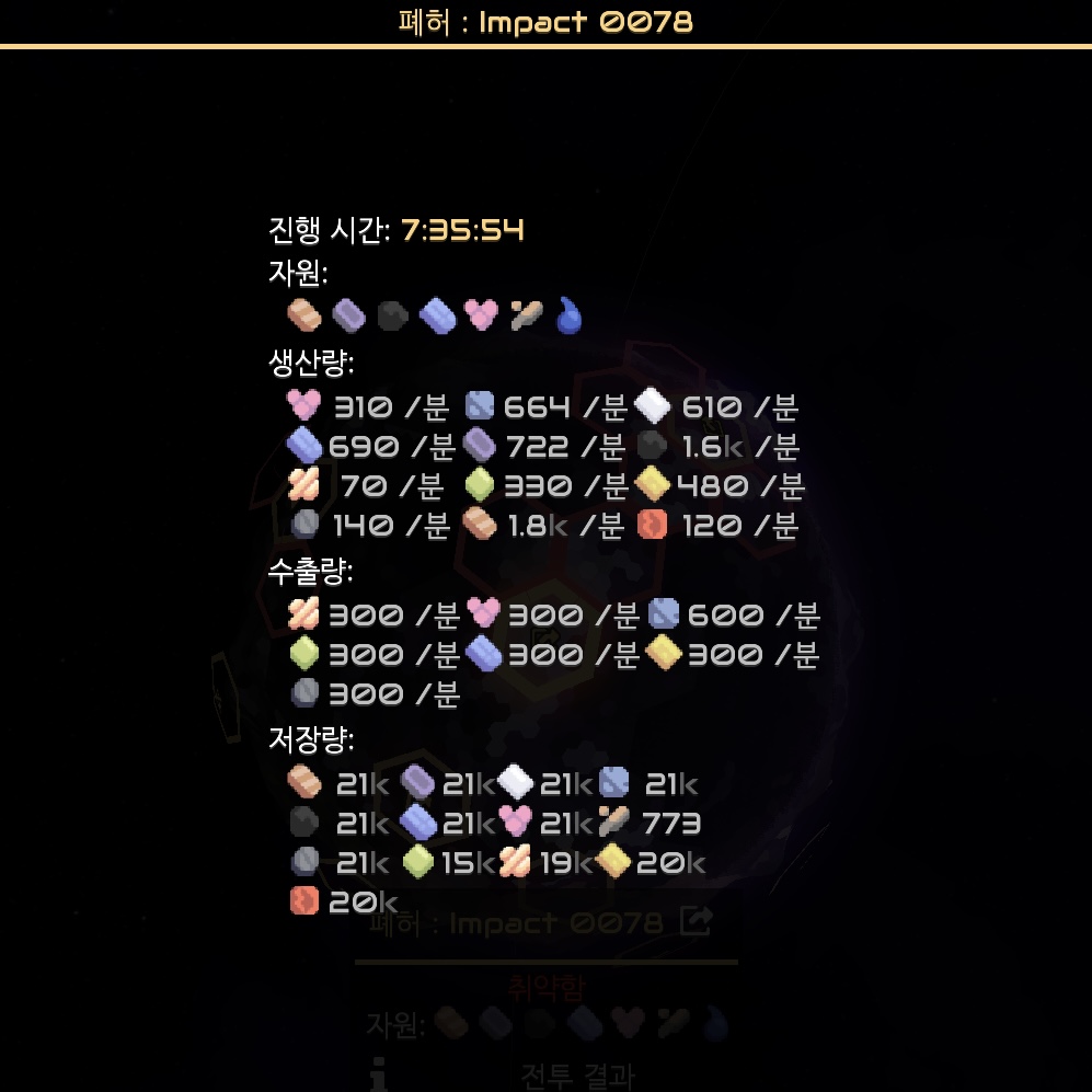 폐허 : Impact 0078의 점령 레포트~ 다양한 자원을 전초기지로 보내고 있지만 그래도 생산량이 더 많습니다.