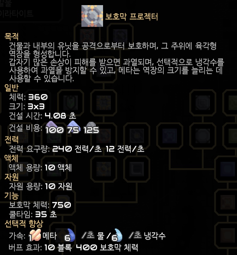 해금되어 연구한 보호막 프로젝터는 역장을 생성해 주위 유닛과 건물을 보호합니다. 디펜스 라인 곳곳에 배치하면 상당히 효과가 좋을것 같아요. 메타나 물/냉각수를 이용해 향상이 가능합니다.