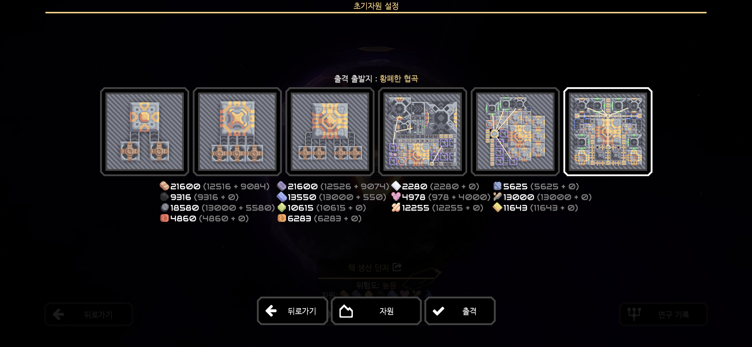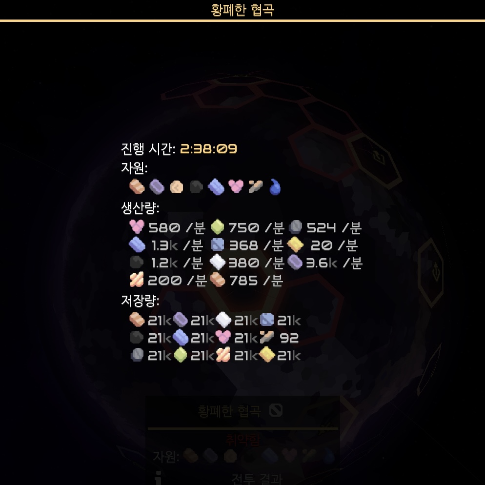 마침내 적의 침공을 모두 막아낸 후, 적당량의 다양한 자원을 훌륭하게 생산해내고 있는 황폐한 협곡! 황폐한 협곡의 최종 레포트입니다.