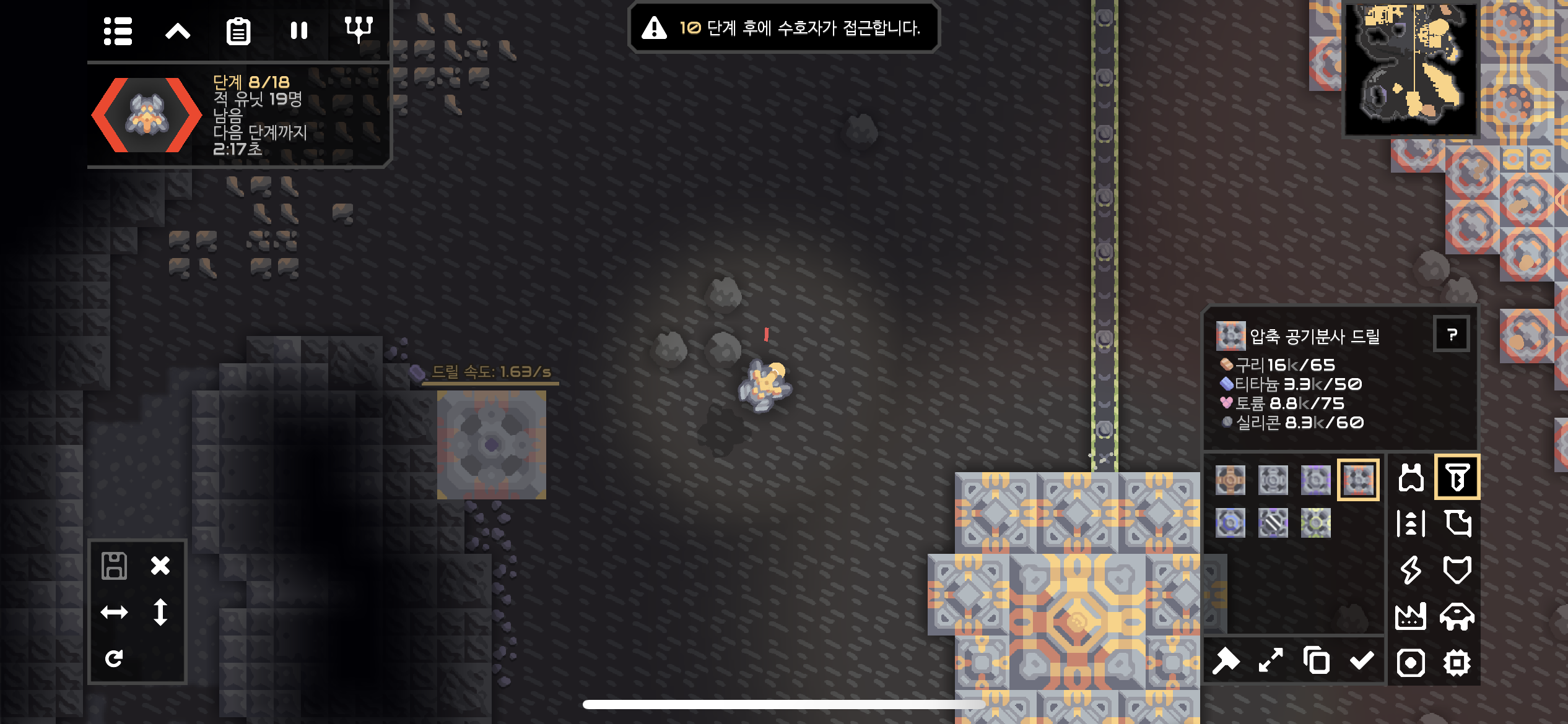 납이 많이 부족해서 작은 납 광맥에서라도 납을 생산하기 위해 압축 공기분사 드릴을 배치중입니다.. 수호자 접근 경고와 함께 알아차린 사실, 황폐한 협곡은 단계가 18단계 뿐이네요.