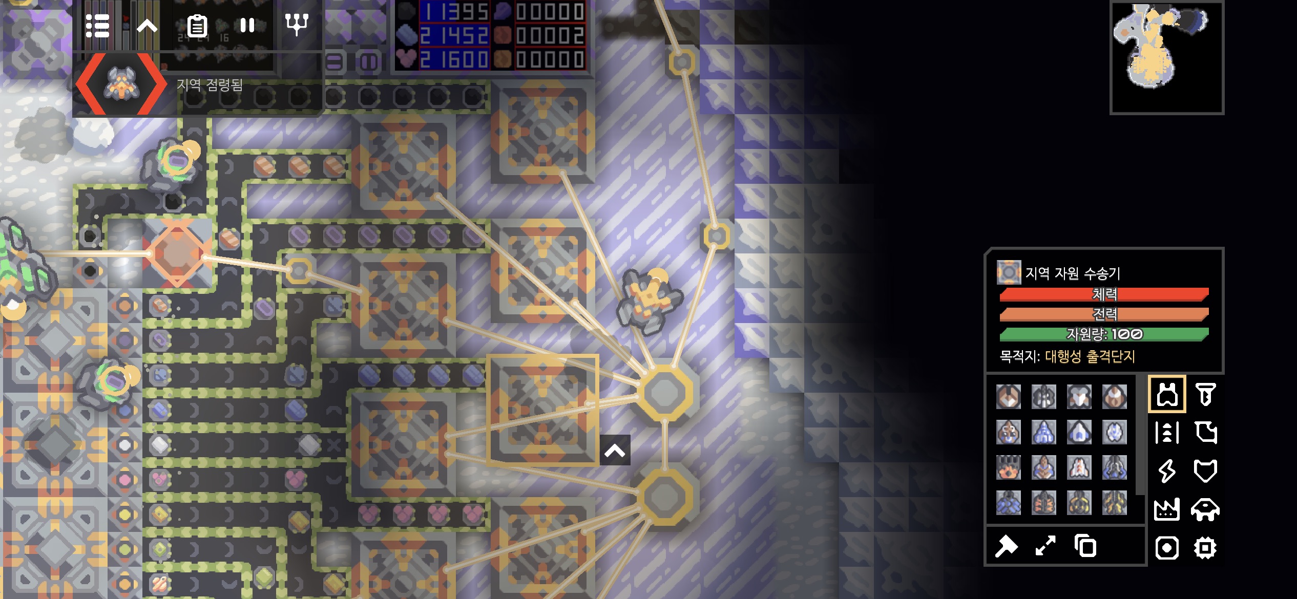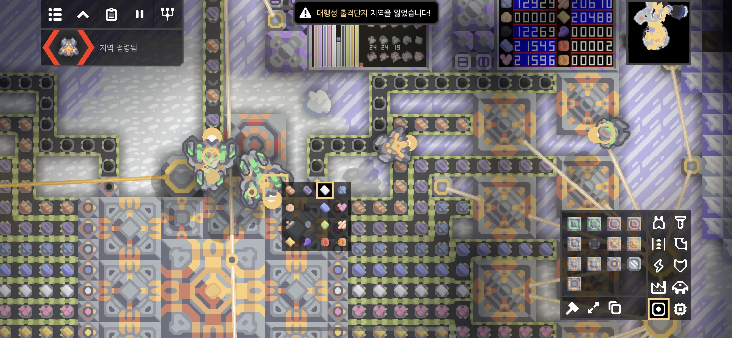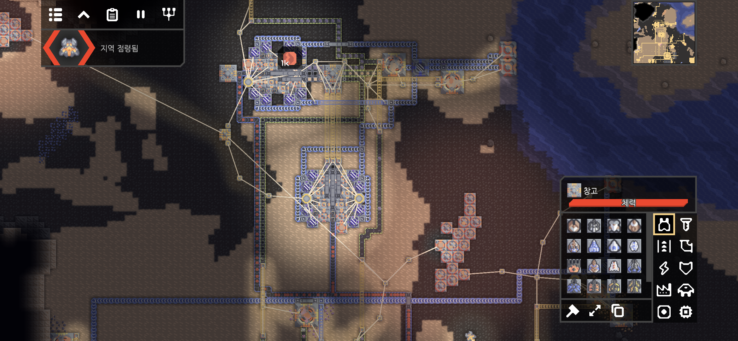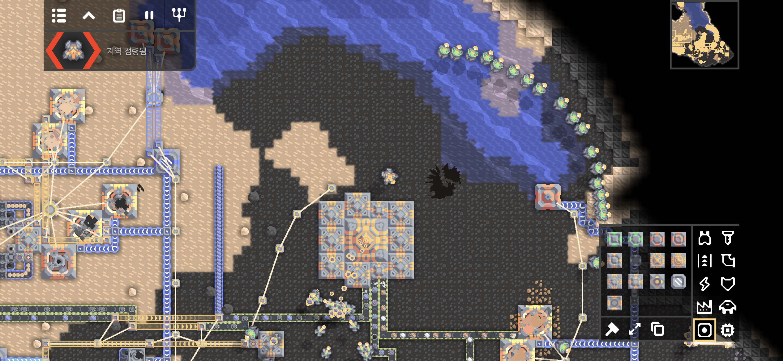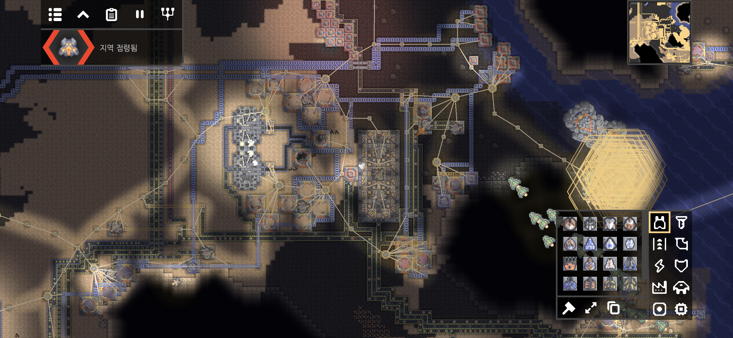 대행성 출격단지의 지역 점령 후 미니맵입니다. 육지 대부분에 아군의 건물과 시설들이 배치되었습니다.