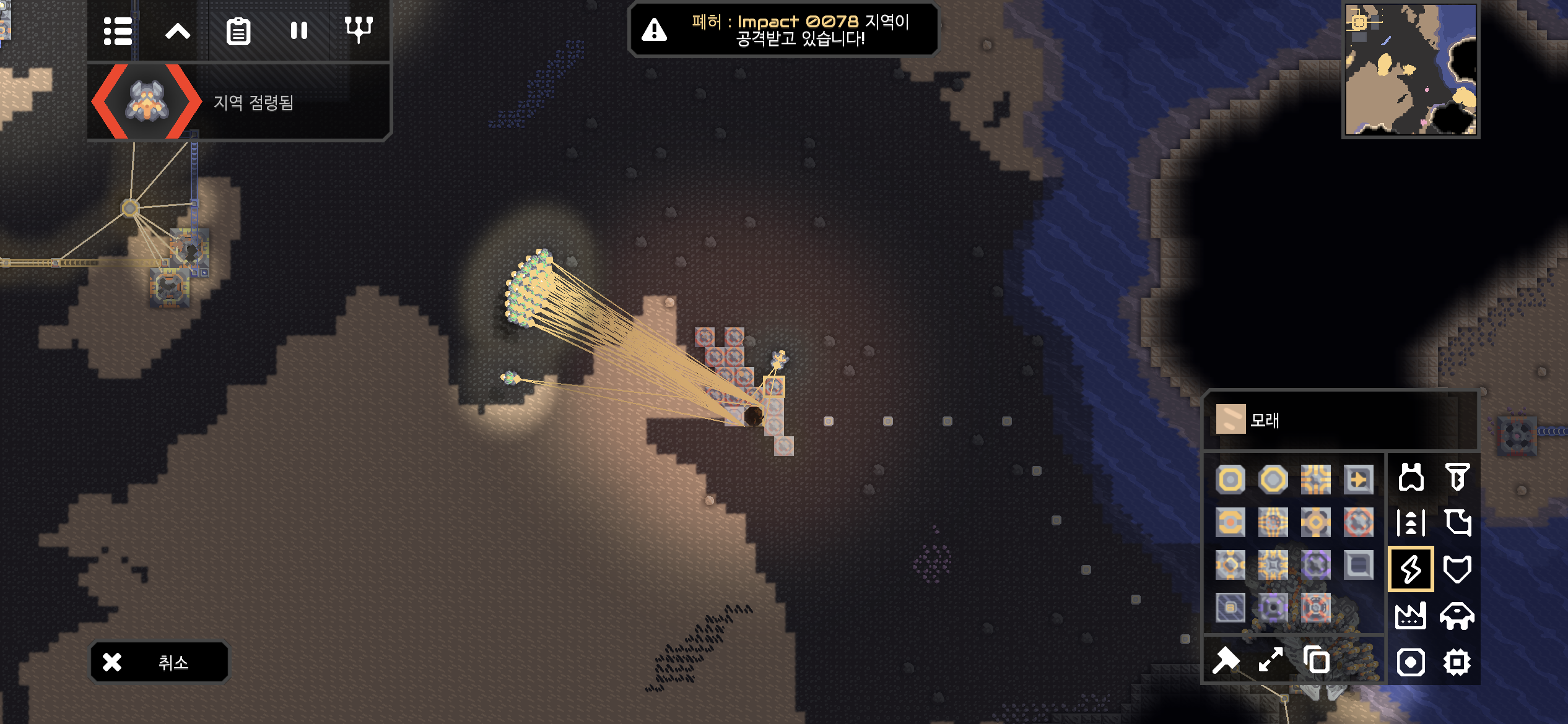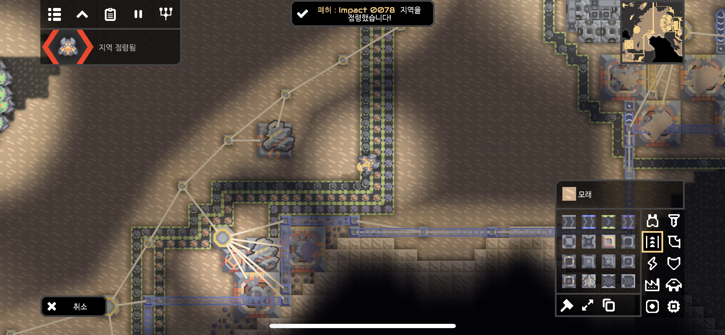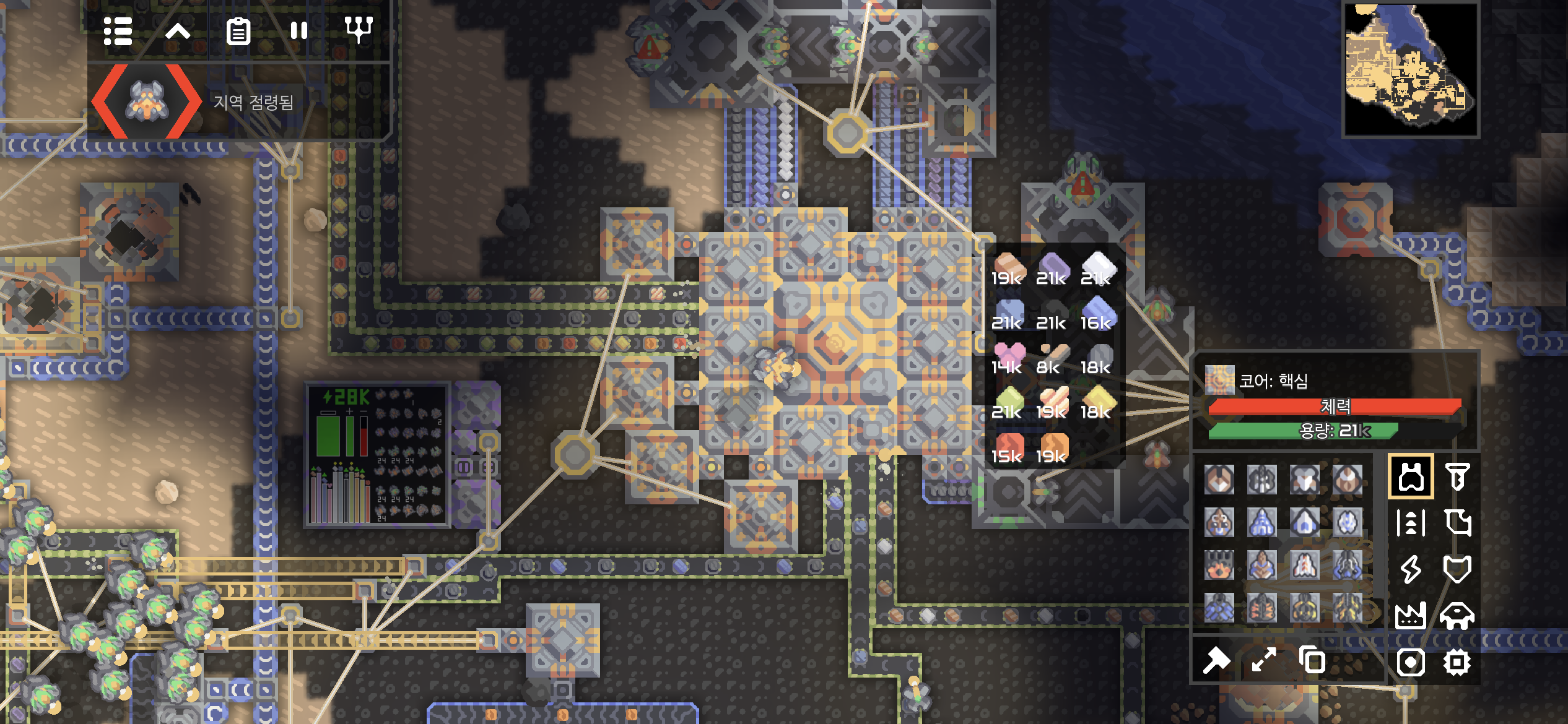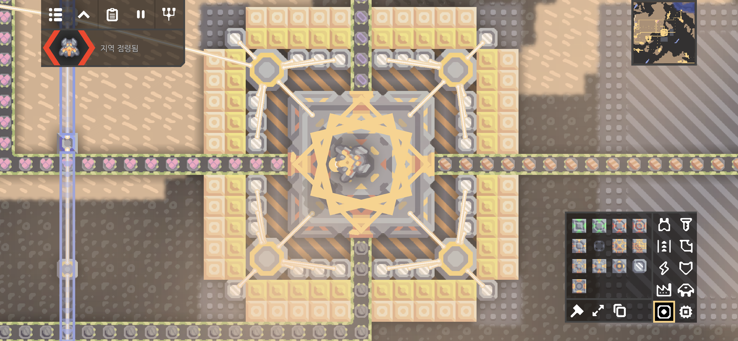 대행성 출격단지의 지역 점령 후 미니맵입니다. 육지 대부분에 아군의 건물과 시설들이 배치되었습니다.
