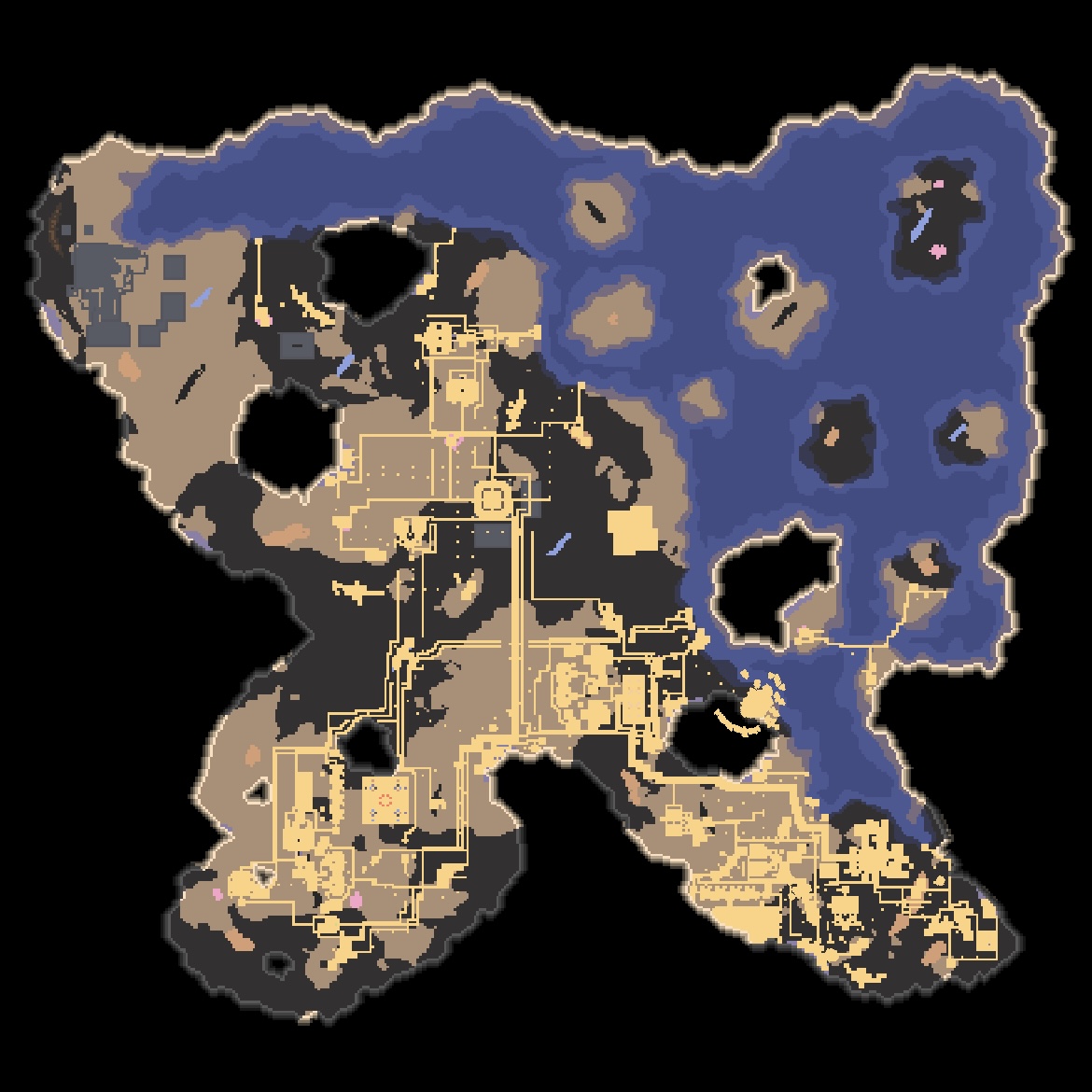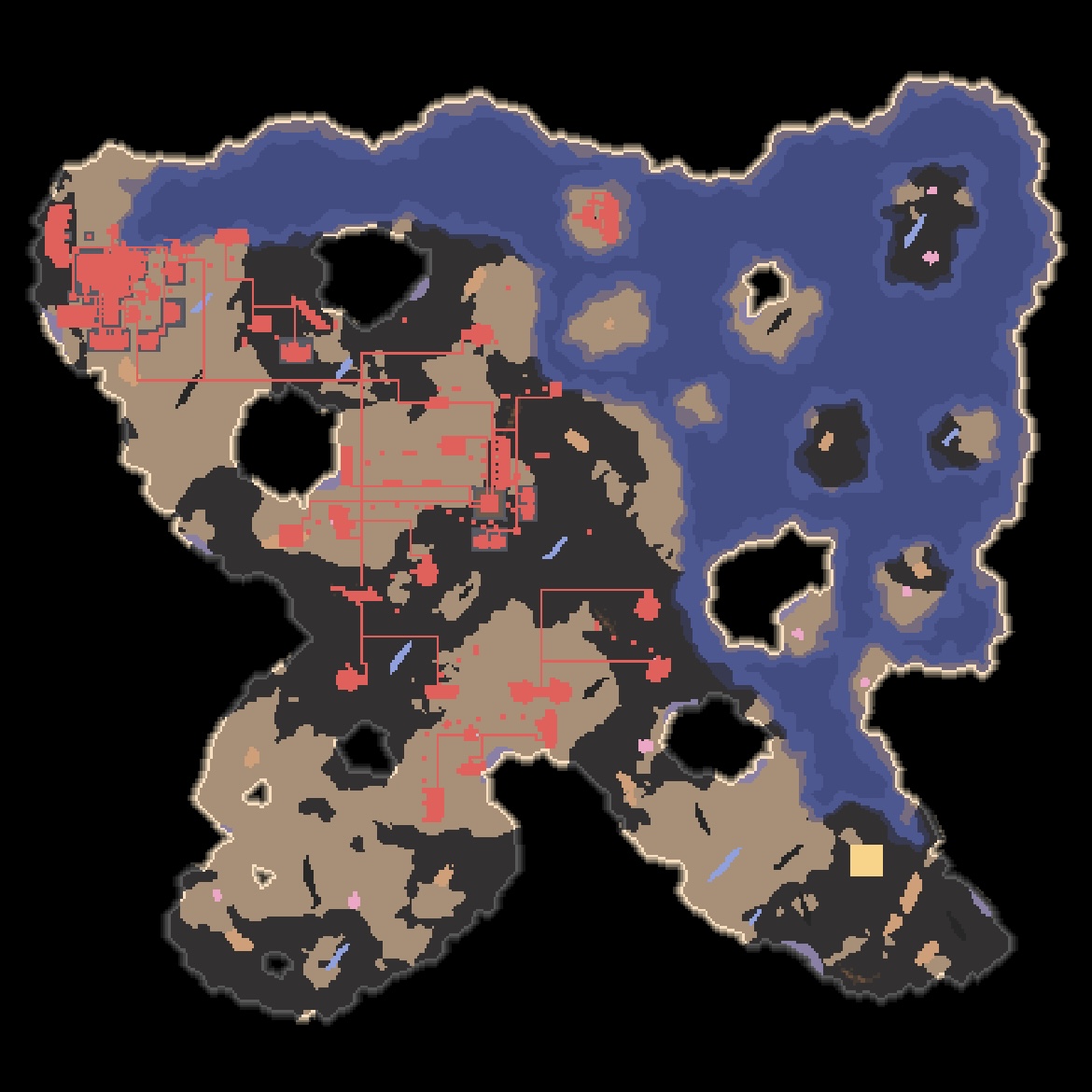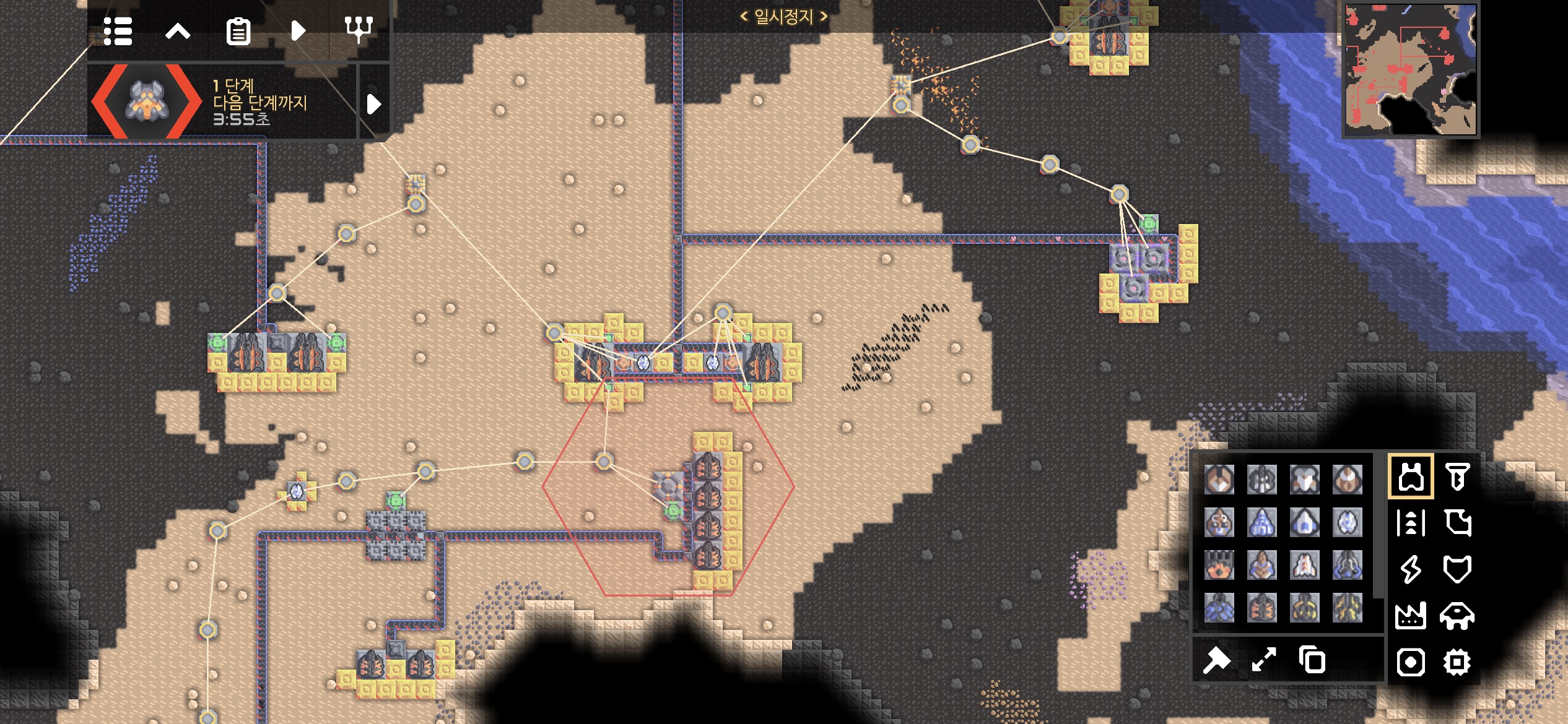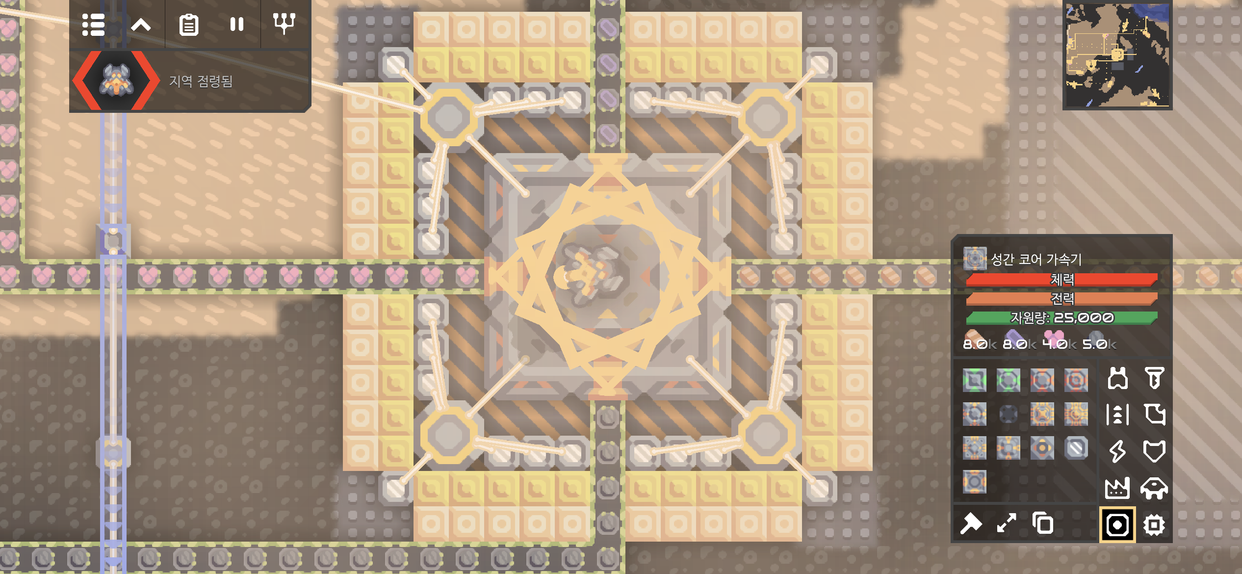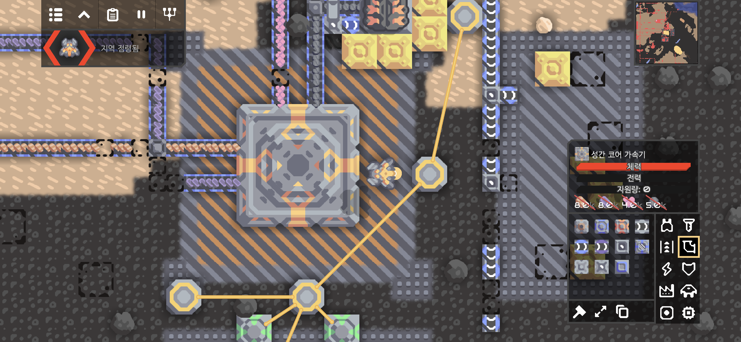 대행성 출격단지의 지역 점령 후 미니맵입니다. 육지 대부분에 아군의 건물과 시설들이 배치되었습니다.