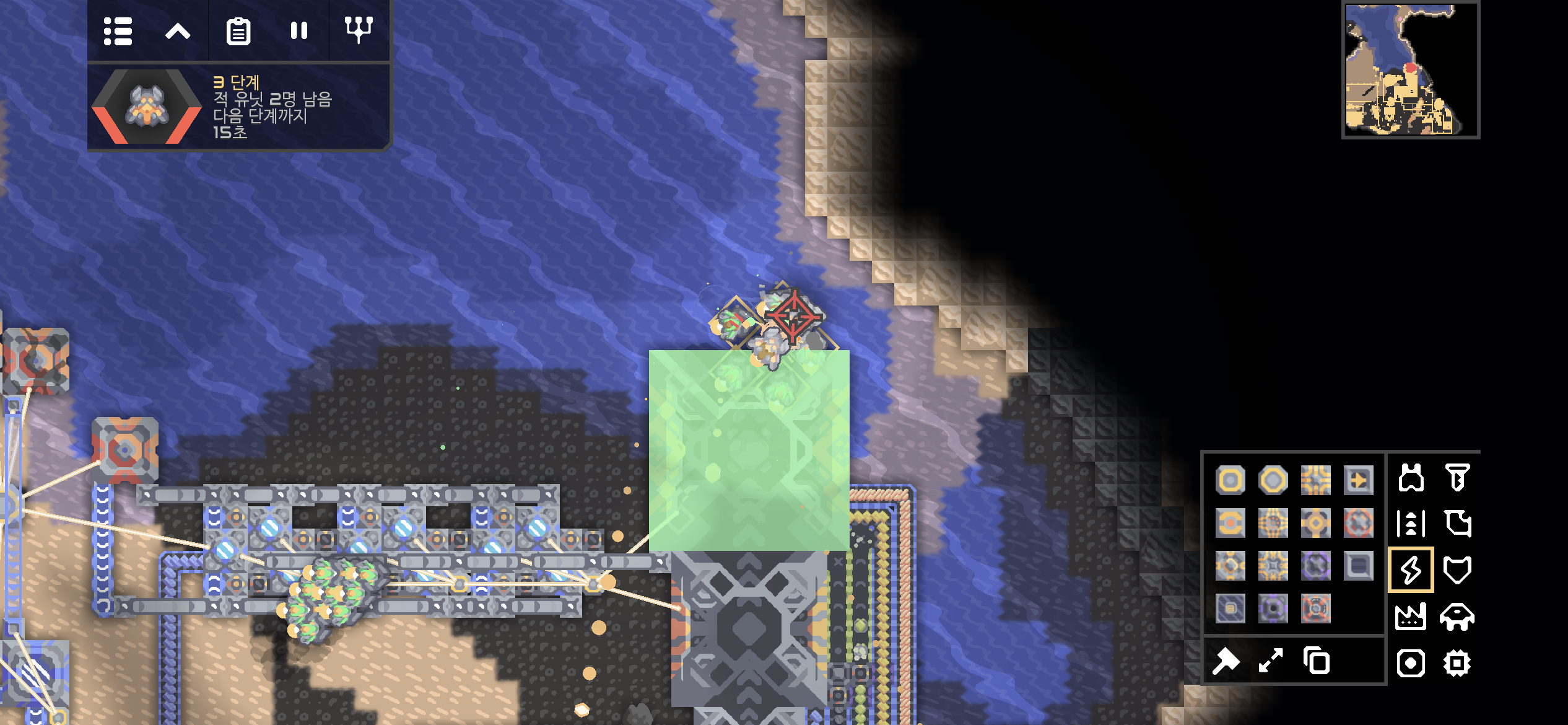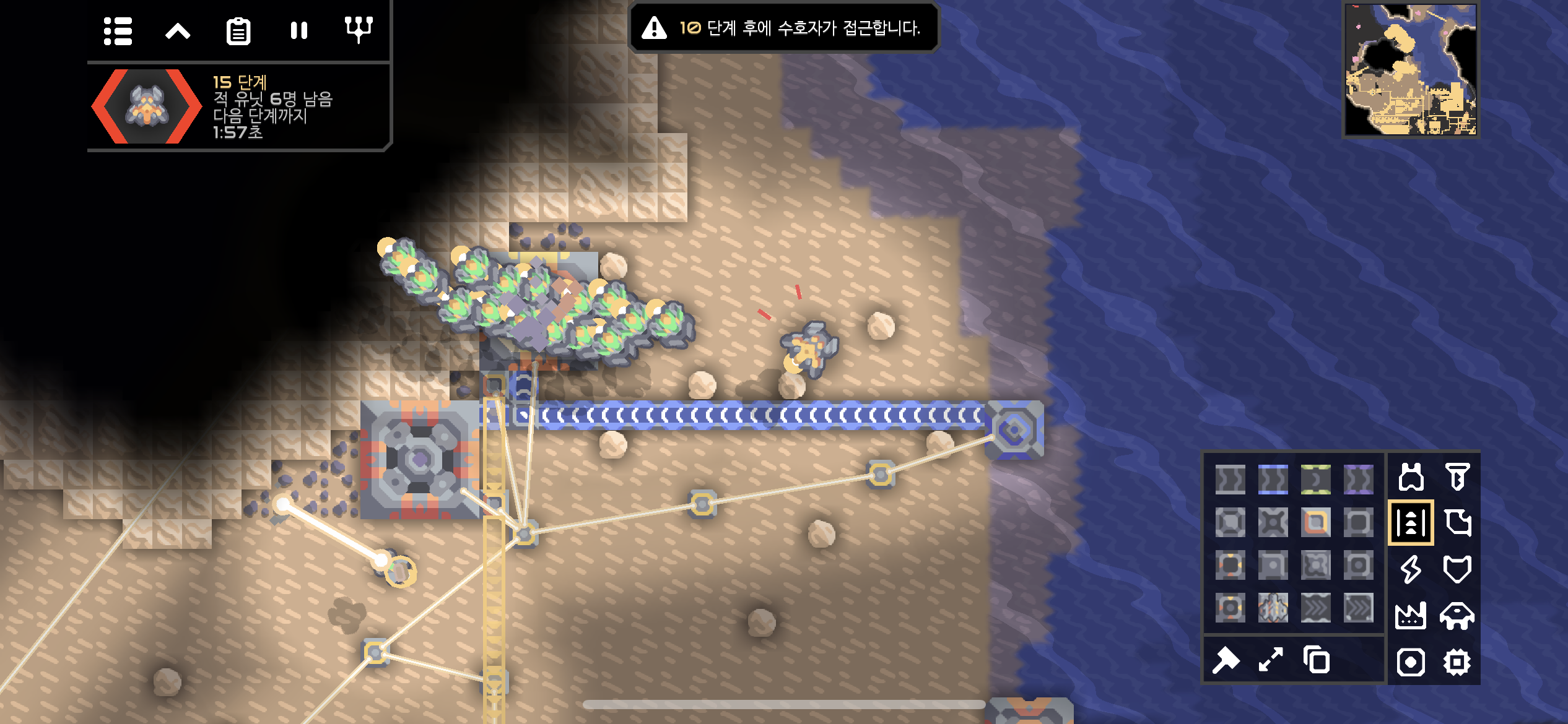 지속적으로 공격해오는 적의 해상 유닛을 대비하기로 합니다. 바닷길 하나는 대형 구리 벽으로 차단해버리고, 대형 티타늄 벽과 아크를 건설해 적을 막습니다.