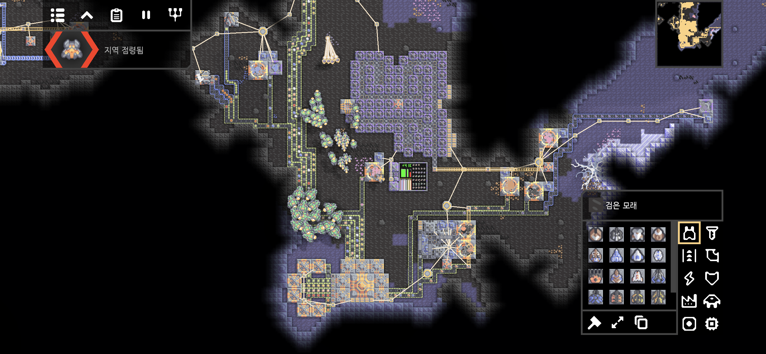 섹터 124 미니맵. 적이 넓은 영역을 차지하고 있습니다. 왼쪽은 검은 모래, 오른쪽은 타르로 이뤄진 지형입니다. 검은 모래와 티타늄으론 플라스터늄을, 토륨과 모래로는 메타를 생산하기에 좋겠네요.