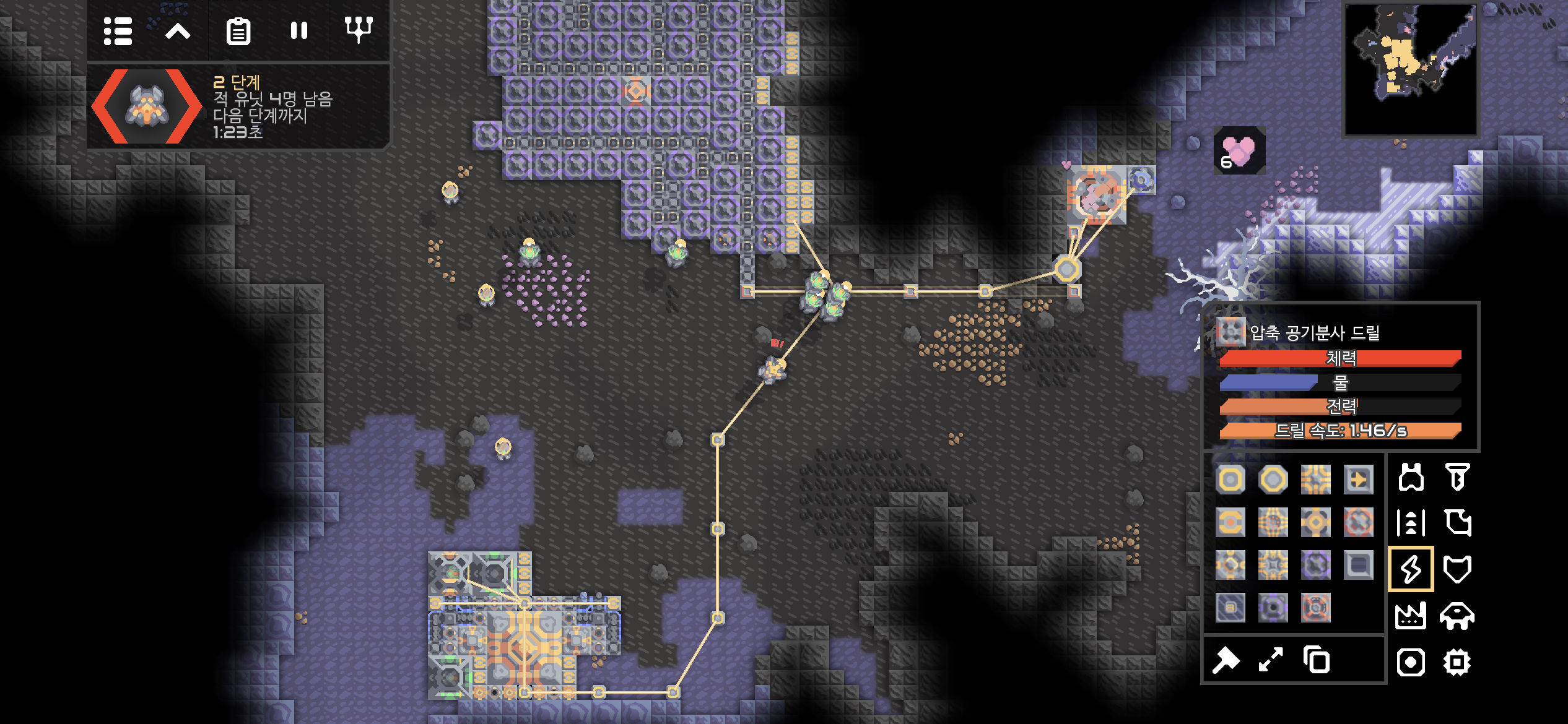 낮은 효율이지만 토륨을 채굴중인 압축 공기분사 드릴. 부족한 전력임에도 토륨을 여섯개나 채굴했네요~ 대단합니다.
