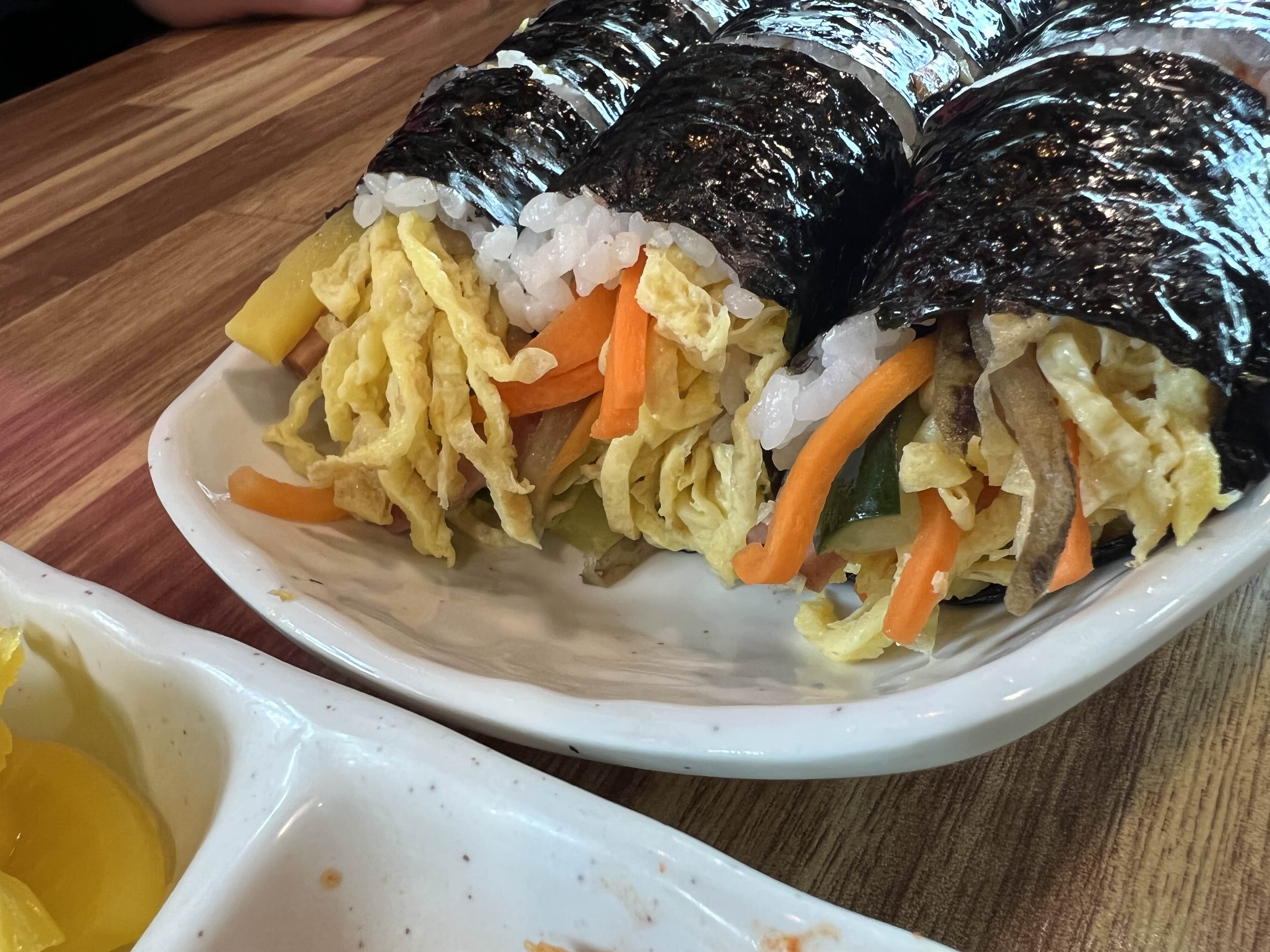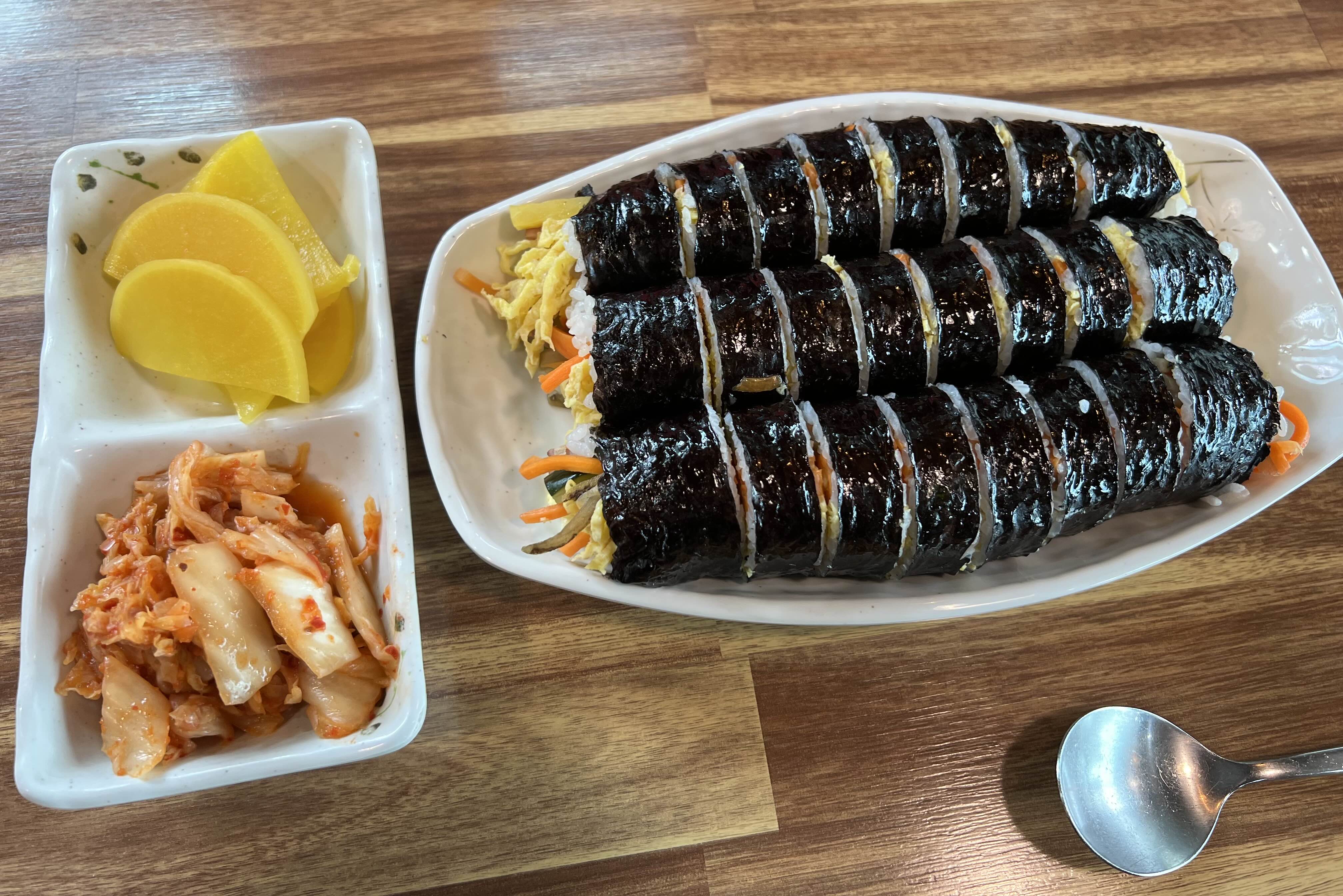 여러 김밥재료들이 짜지않고, 튀는 맛 하나 없이 부드럽게 잘 어울리는 맛이었습니다. 김밥김도 꽤나 좋은 재료를 쓰는듯한 맛이었어요. 밥, 오이, 당근 등등 김밥의 모든 재료가 부드러워 씹어 먹기에 아주 좋았습니다.