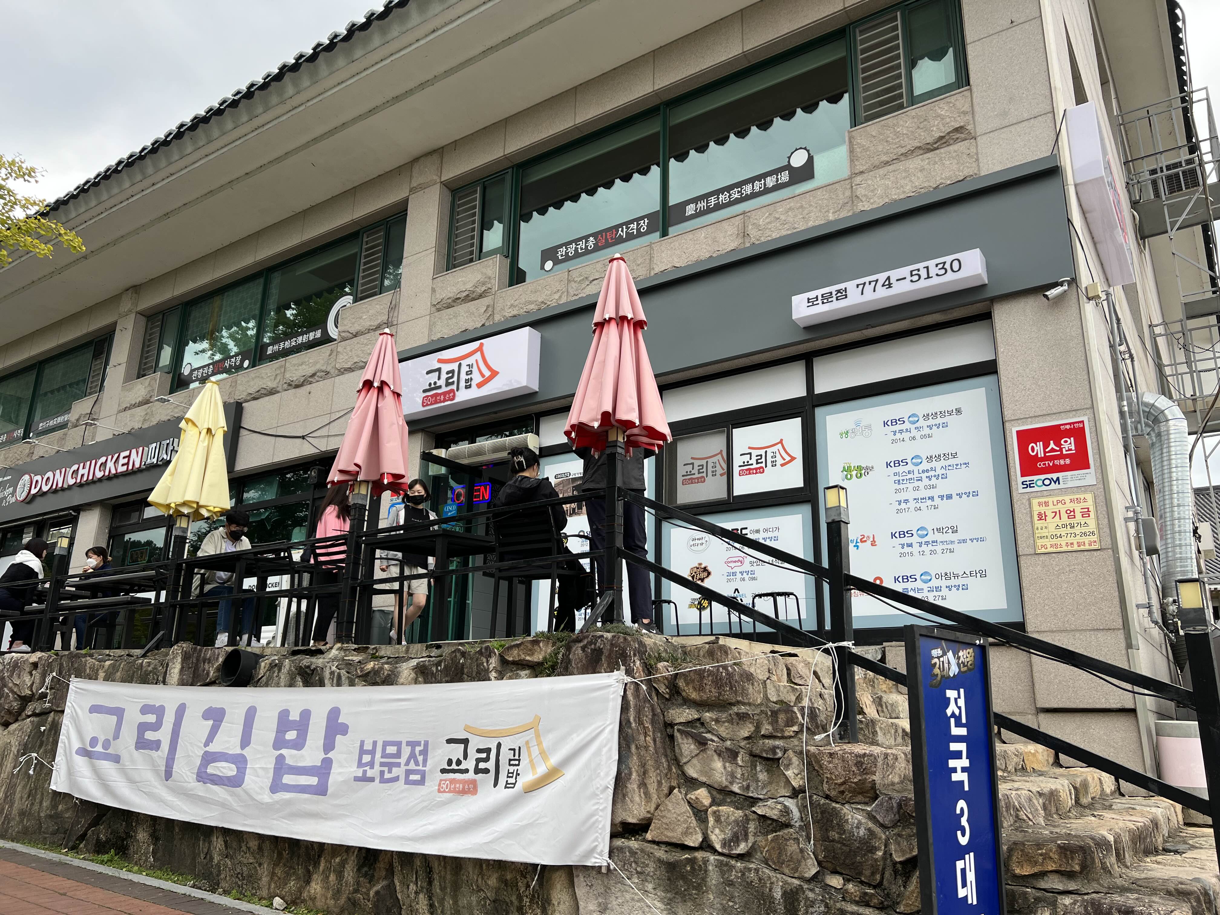 경주 보문단지 교리김밥의 전경. 야외에서 식사를 할 수 있는 테이블이 있습니다만, 대부분의 자리엔 대기중인 포장 손님들로 가득합니다. 이른 아침이었는데도 대단한 인기입니다.