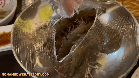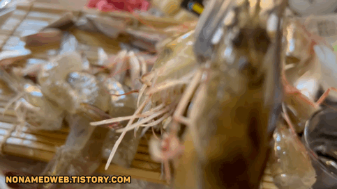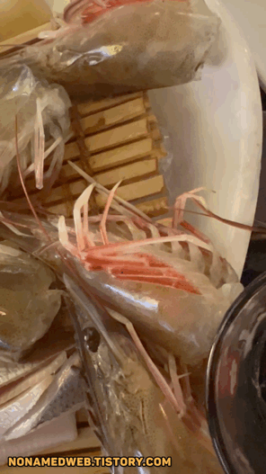 이어서 주문한 활새우. 매우매우 싱싱해서 펄펄 뜁니다. 저희가 활새우 먹는 모습을 보곤 맛있어 보였는지, 옆테이블이서도 주문하더라구요.
